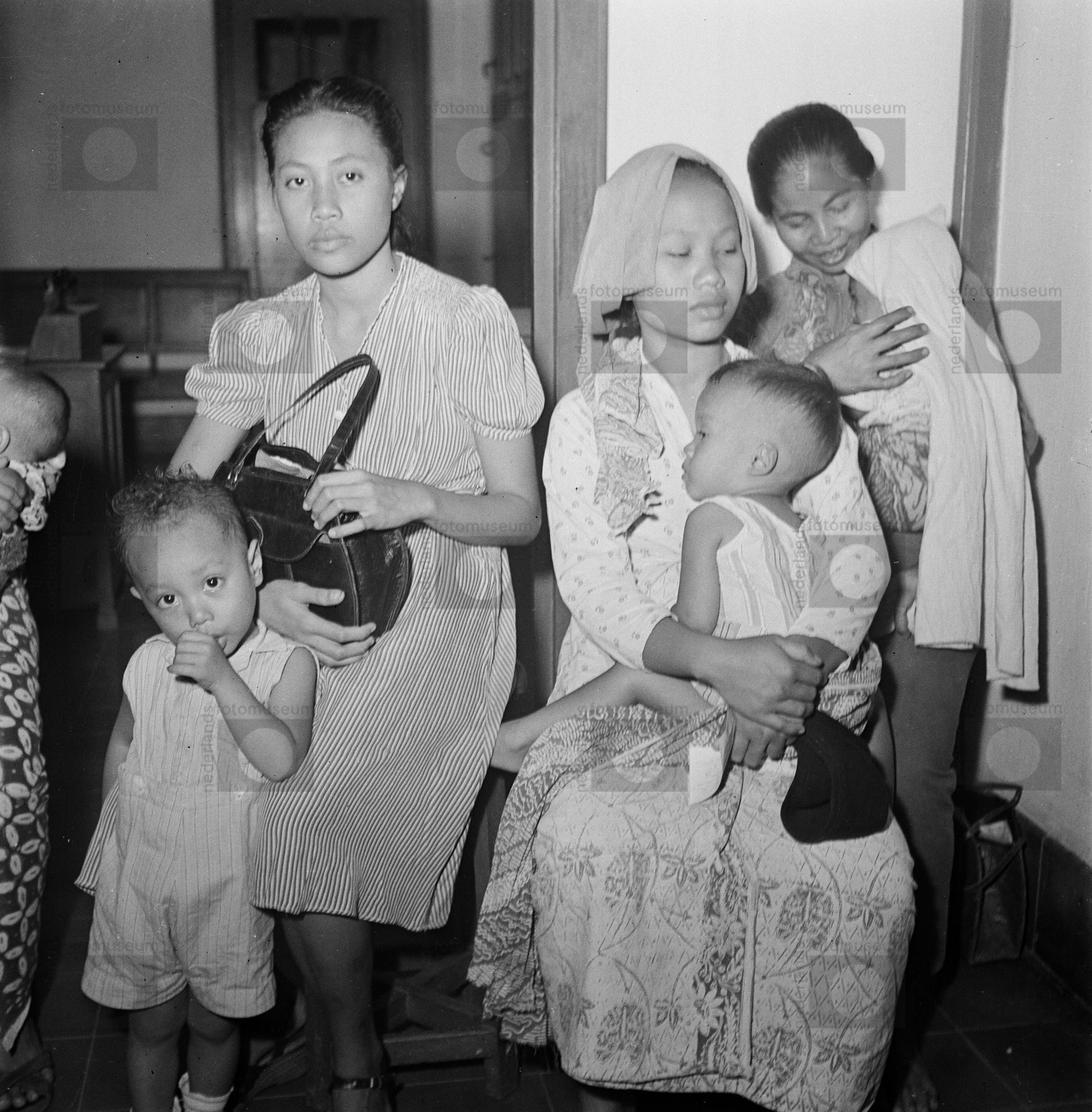 Drie moeders zitten met hun kinderen in een kraamkli...