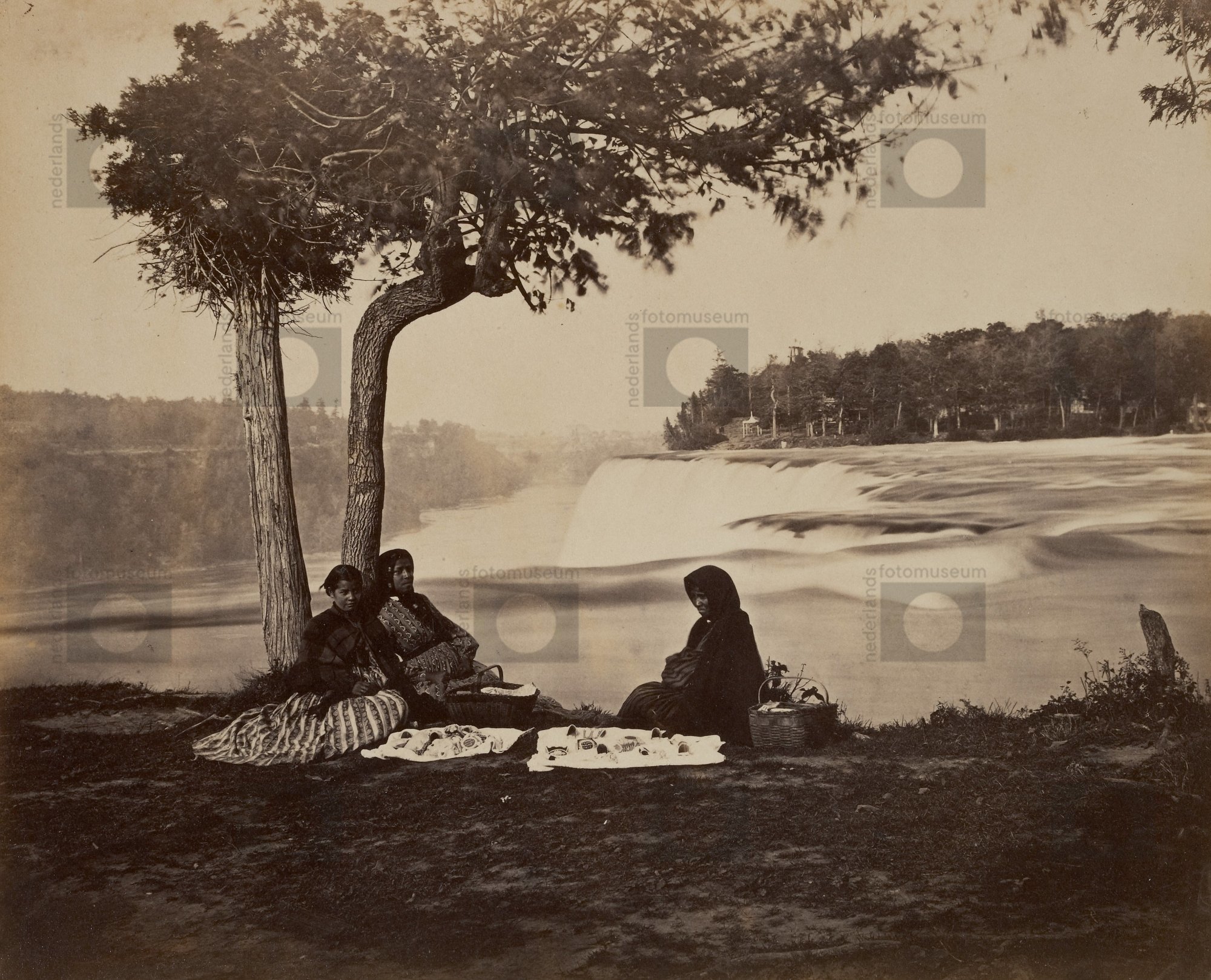 Niagara watervallen met Iroquois vrouwen die handwer...
