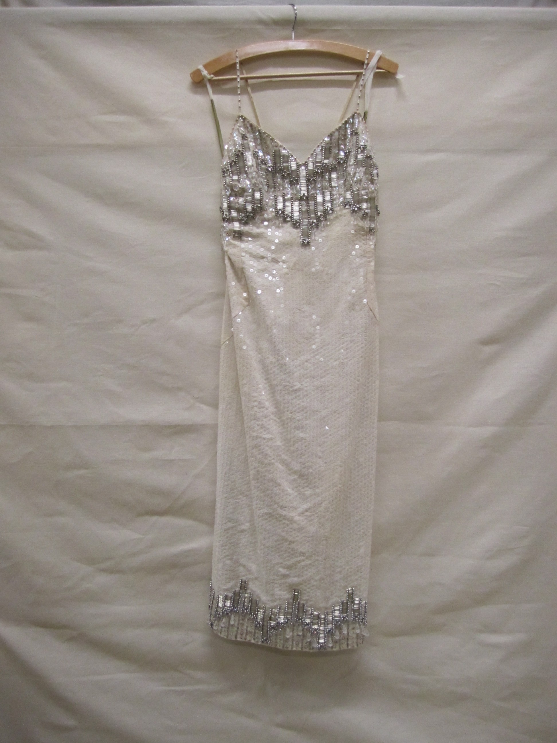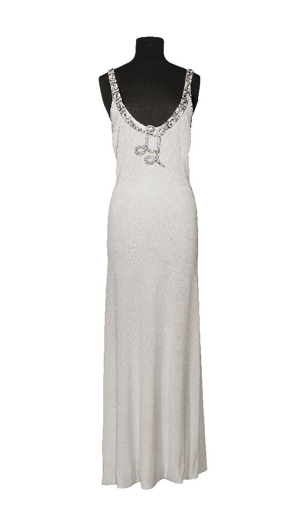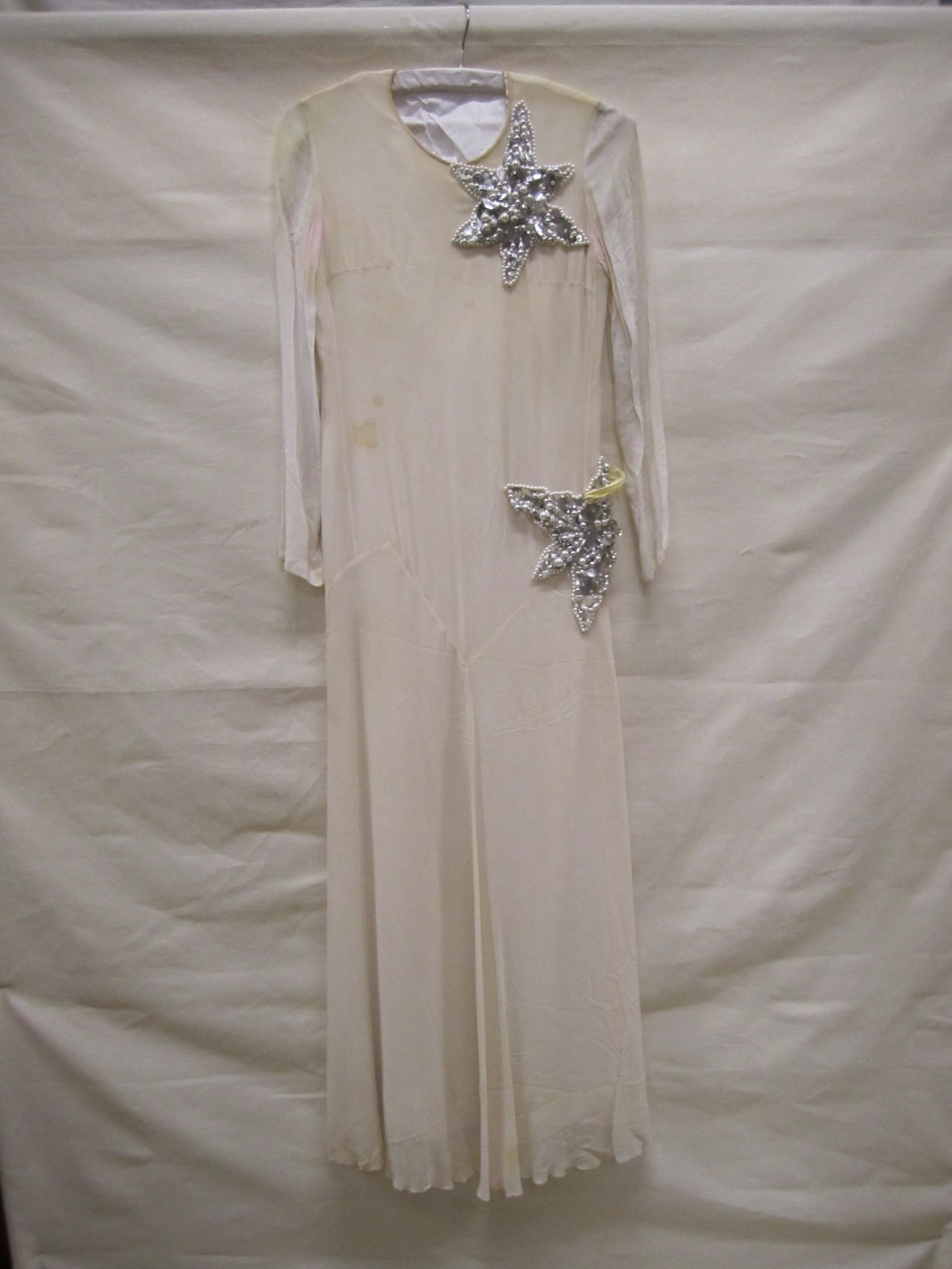 Avondjurk van wit zijden crêpe met stervormige appli...
