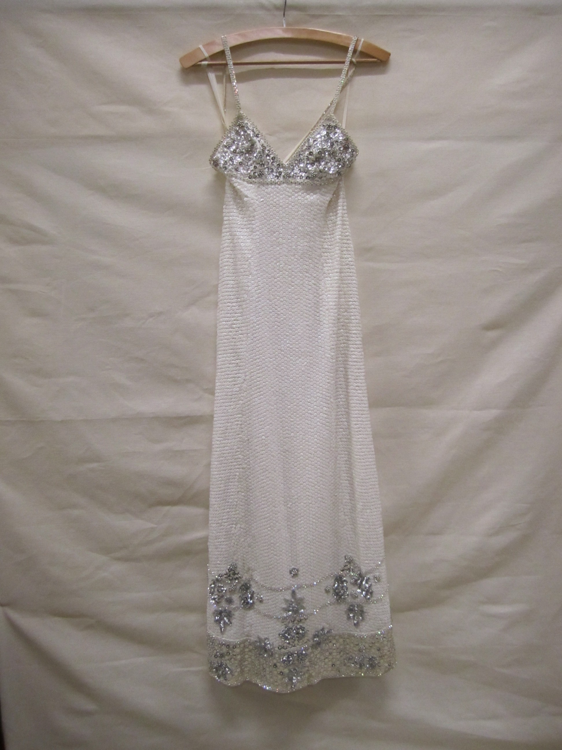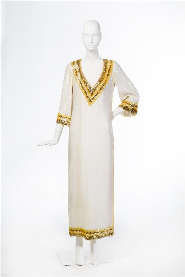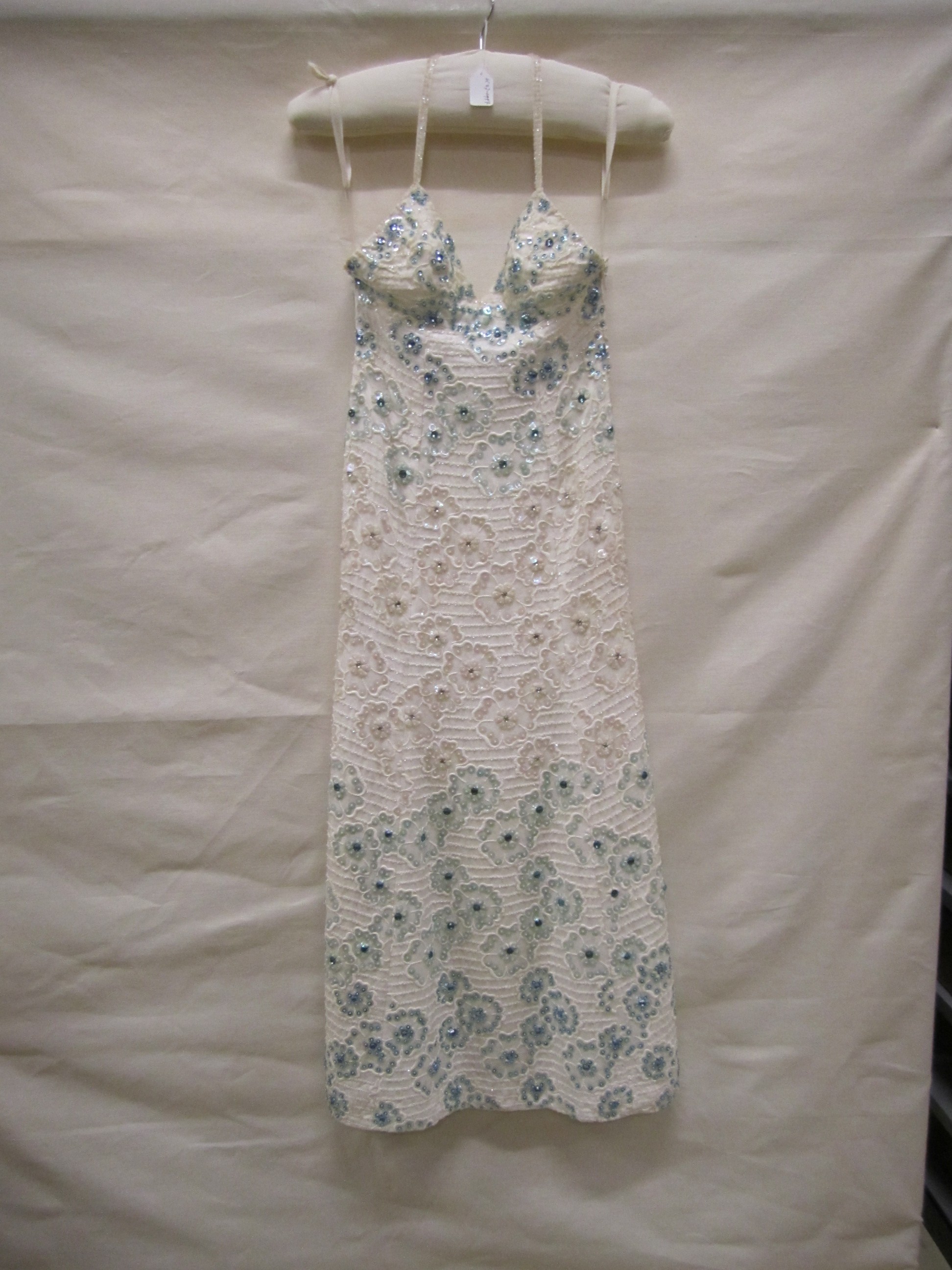 Avondjurk van wit zijden organza geheel bestikt met ...