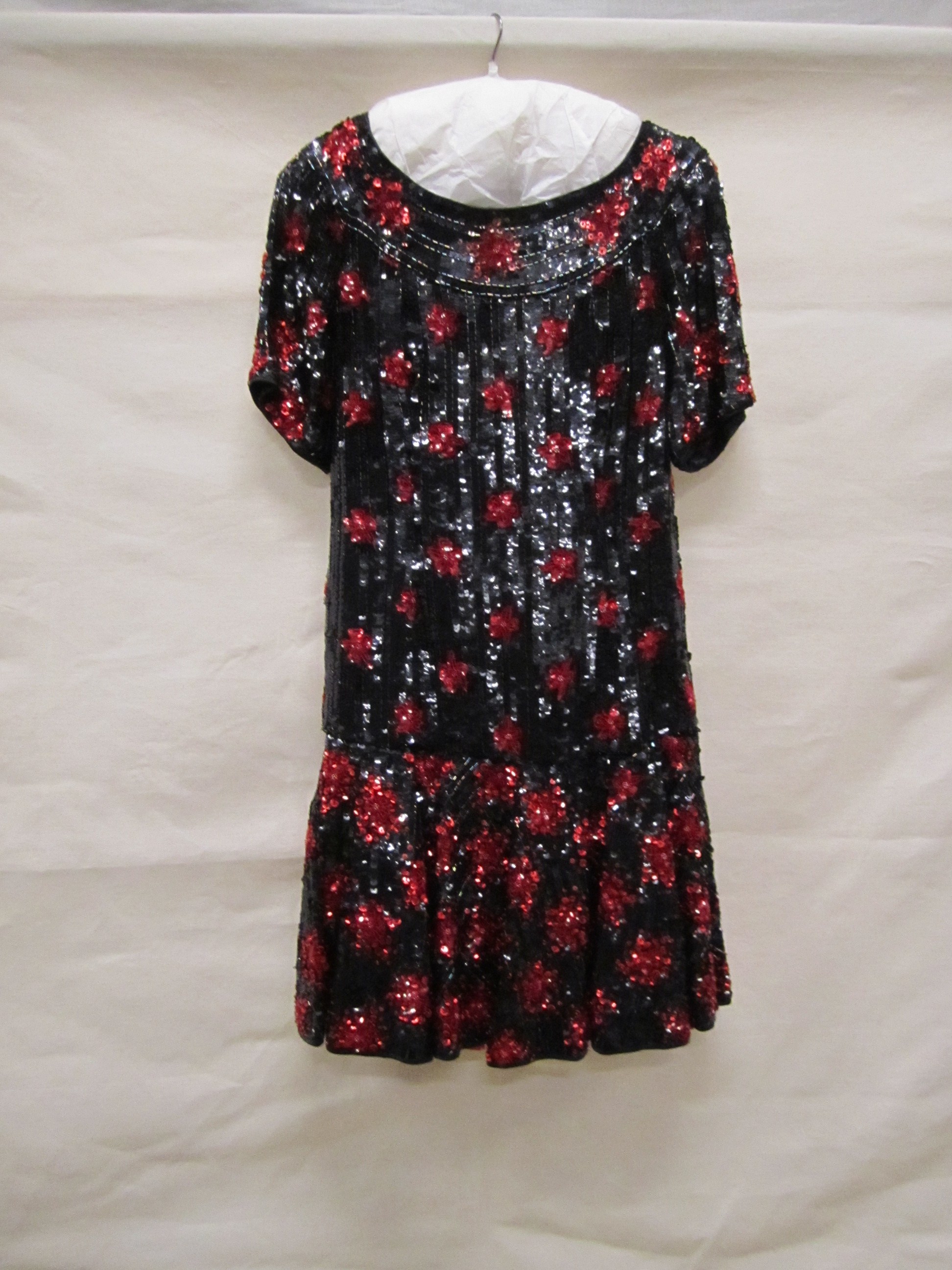 Avondjurk van zwart crêpe bestikt met zwarte en rode...