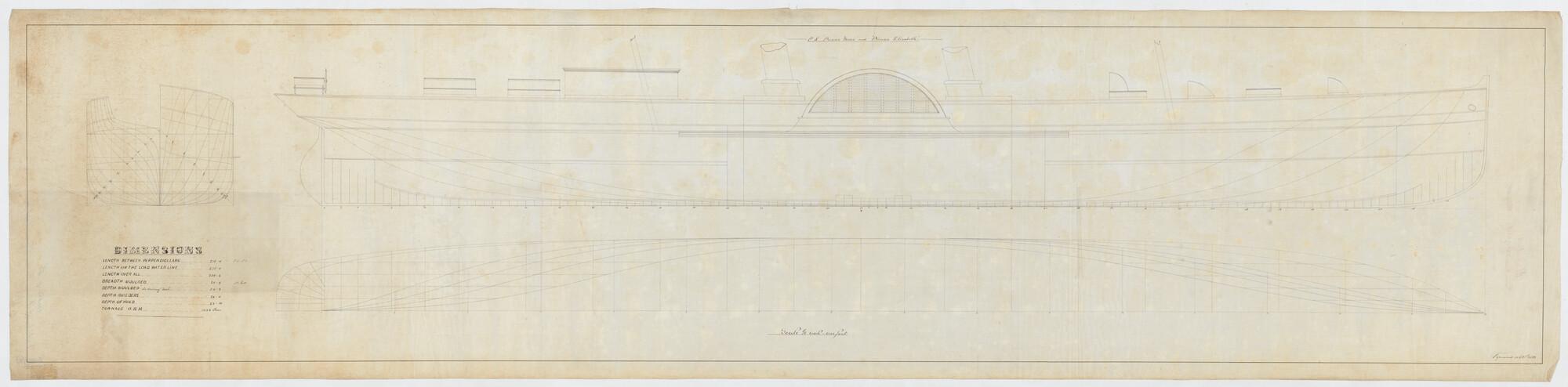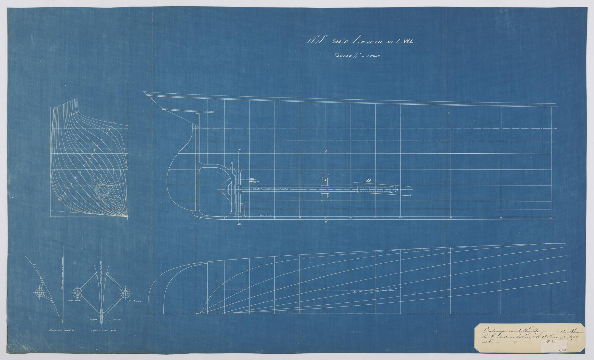 Zijaanzicht, lijnenplan, (Achterschip), spantenraam ...