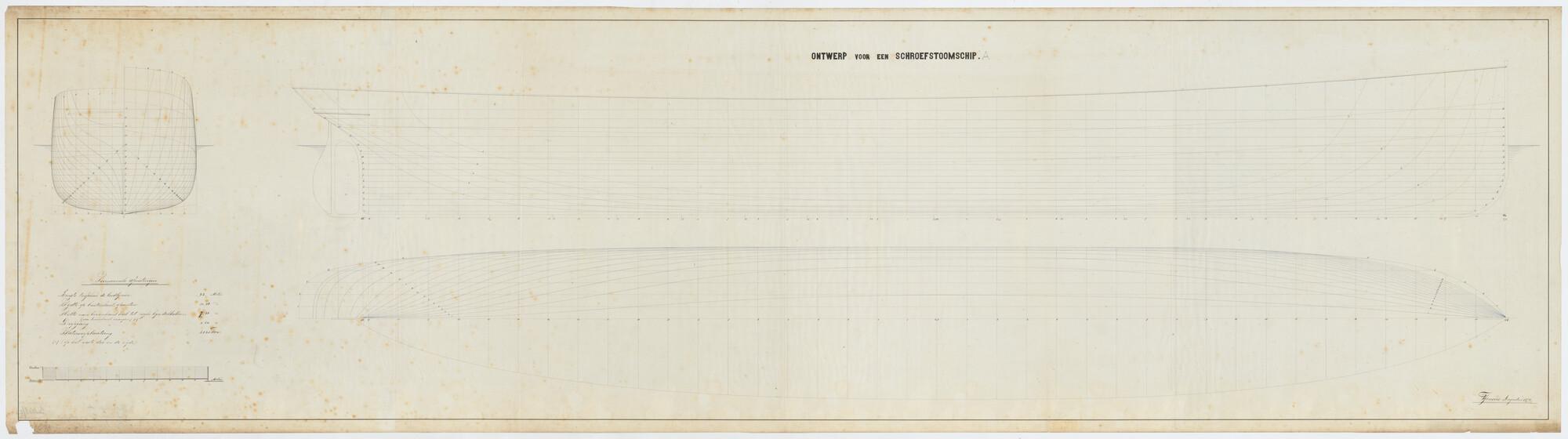 Zijaanzicht, lijnenplan en spantenraam van een schro...