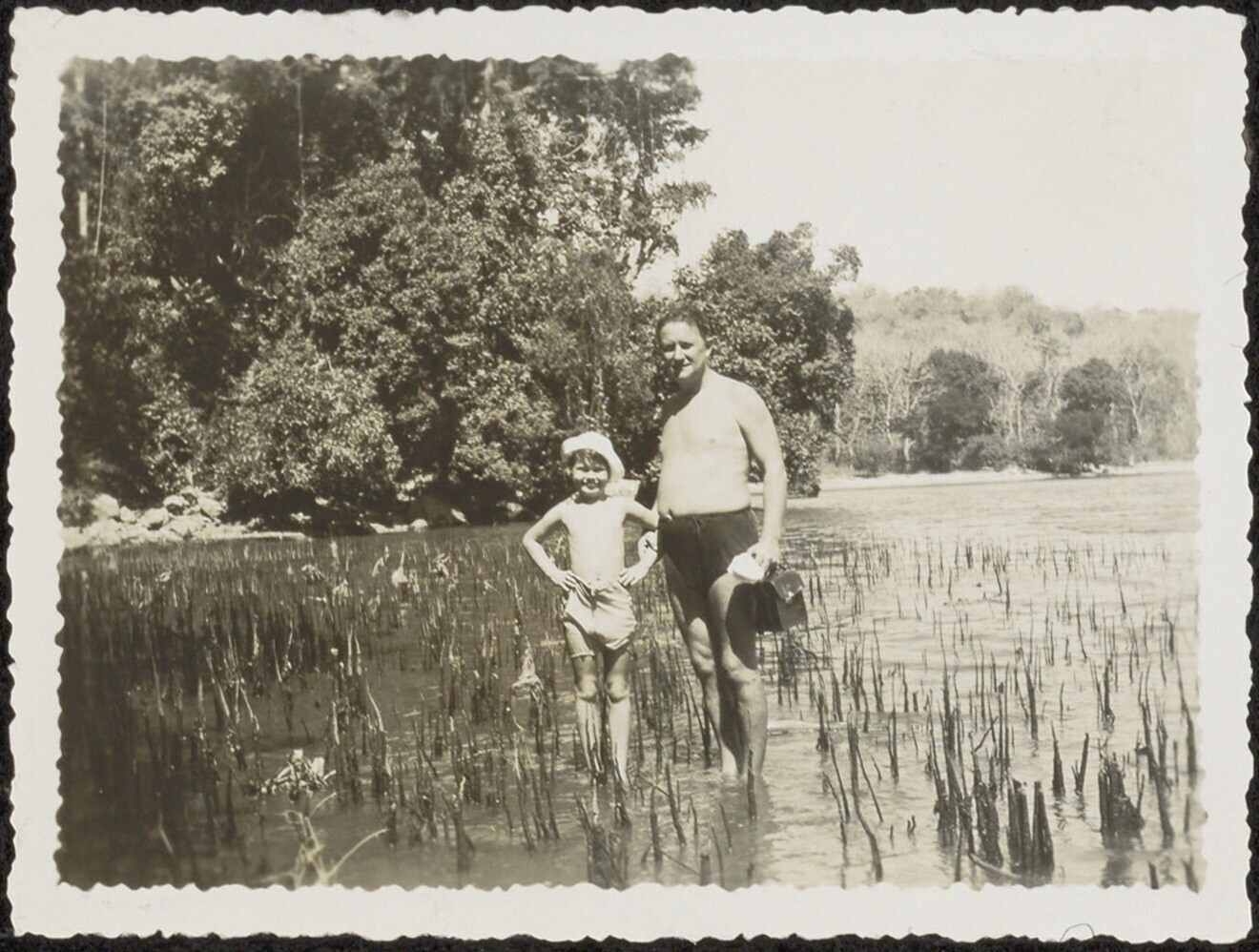 Portret van een man en een jongen in het water bij m...