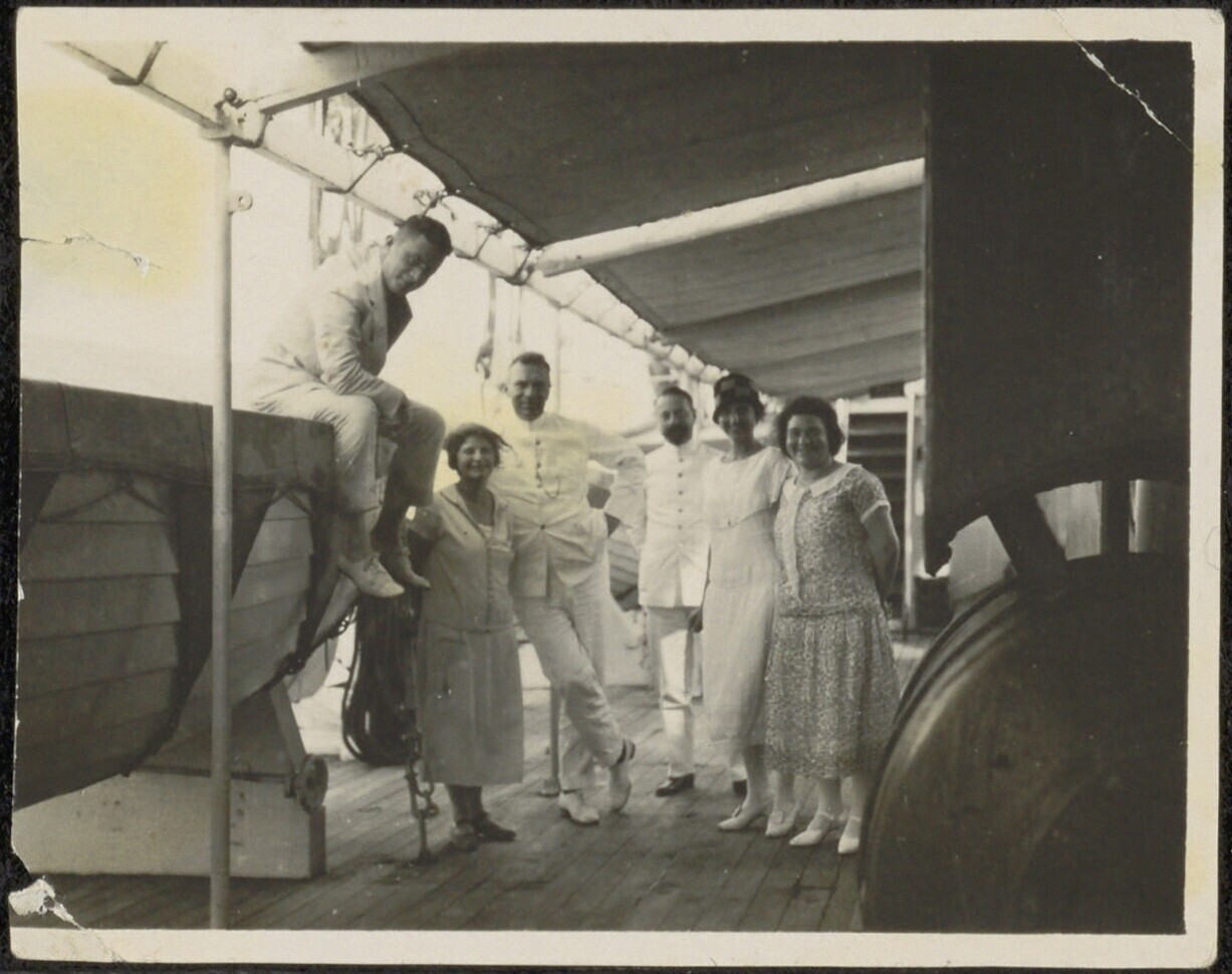 Groepsportret bij kleine boten, vermoedelijk aan boo...