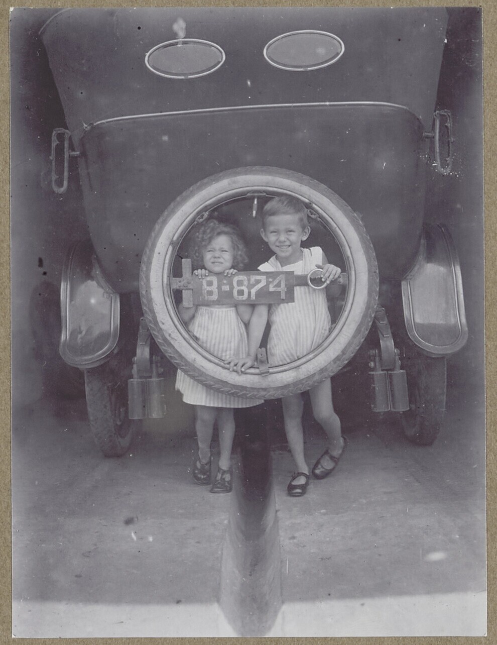 Portrait of two children behind the spare wheel of a...