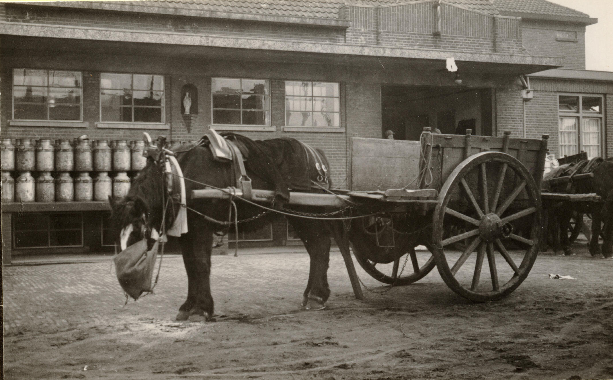 Paard en wagen bij een melkfabriek, Veghel, 1936 (zw...