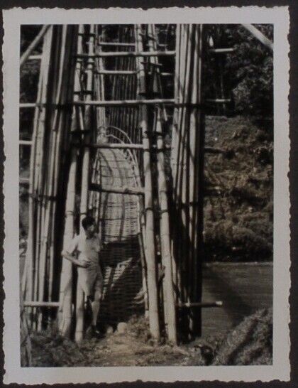 Europese man bij bamboebrug over de rivier Serajoe