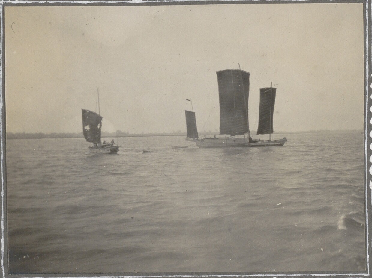 Kleine zeilbootjes op de Yangtze Kiang bij Shanghai