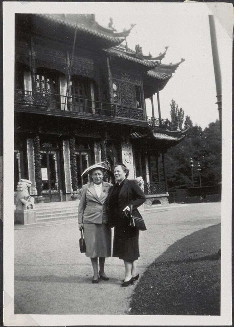 Portret van twee vrouwen voor een Chinese tempel