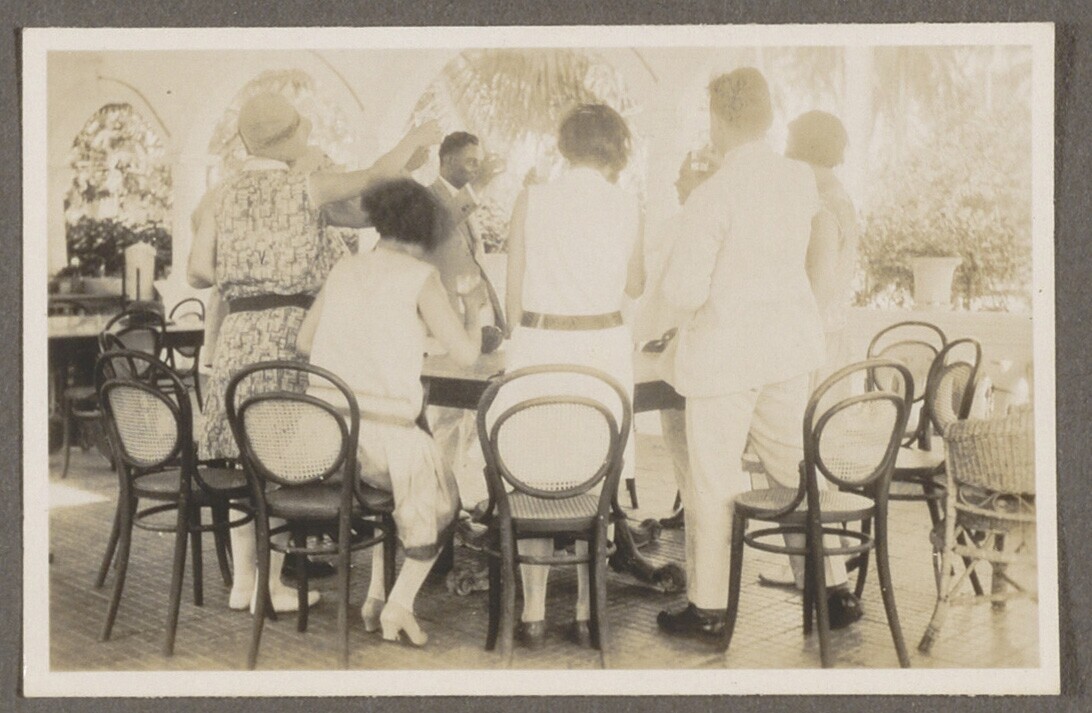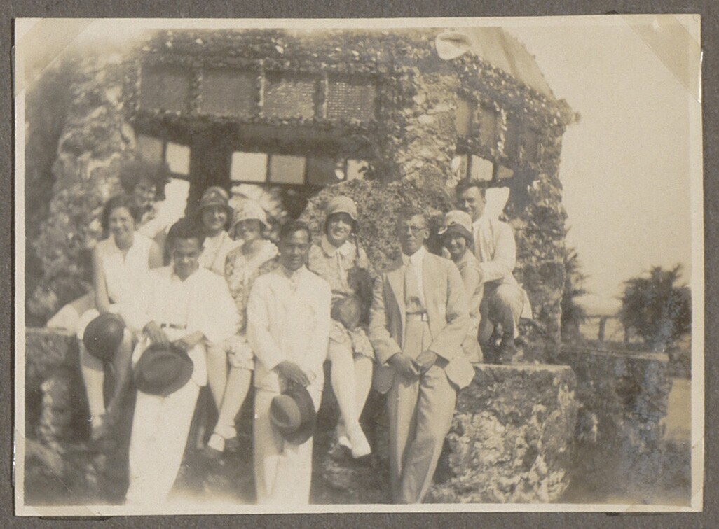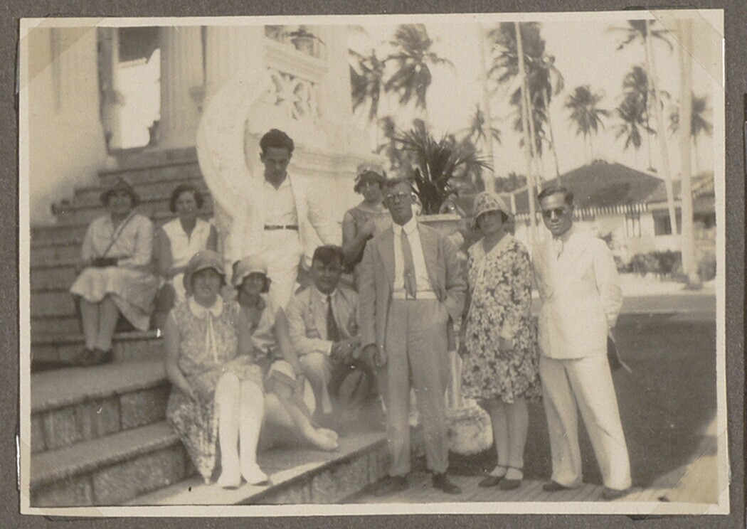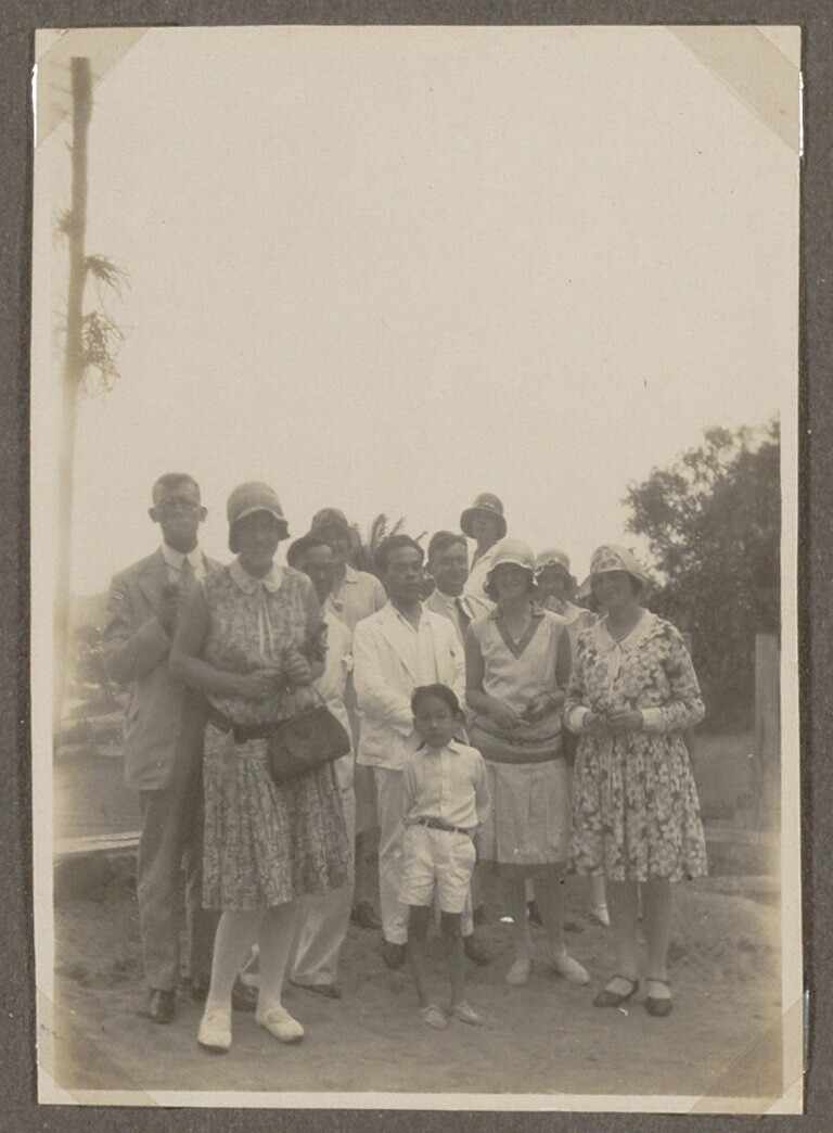 Portret van gezelschap vrouwen en een man
