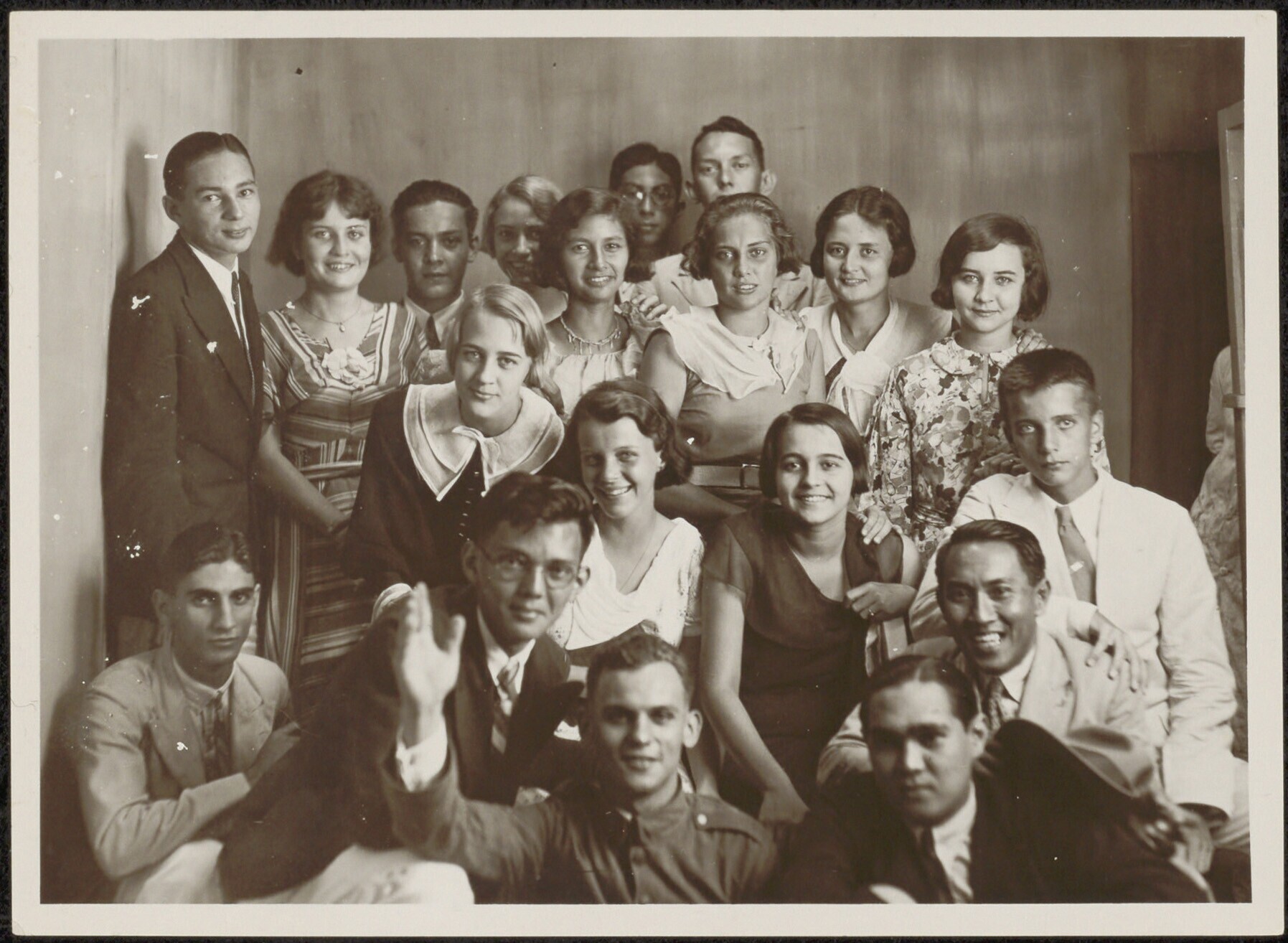 Groepsportret jongeren bij te drogen gehangen wasgoed