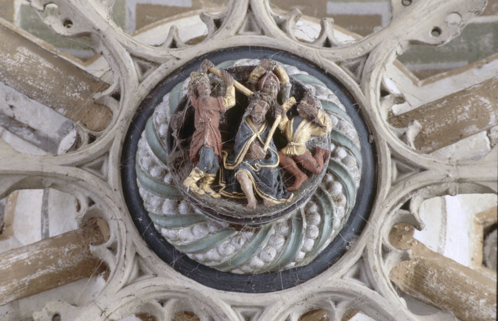 Interieur,middenschip, gewelf,sluitsteen: Christus w...