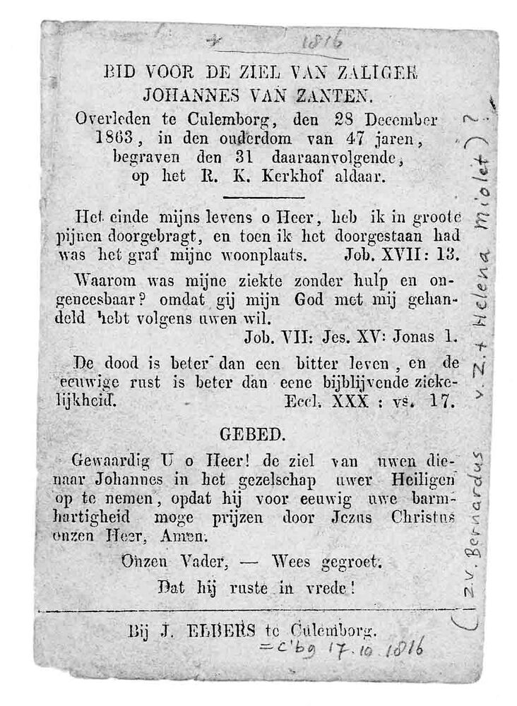 bidprent voor Johannes van Zanten. Geboren 1816, ove...