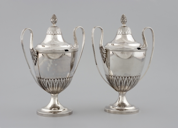 Twee kastanjevazen met hoog opgaande oren, versierd ...