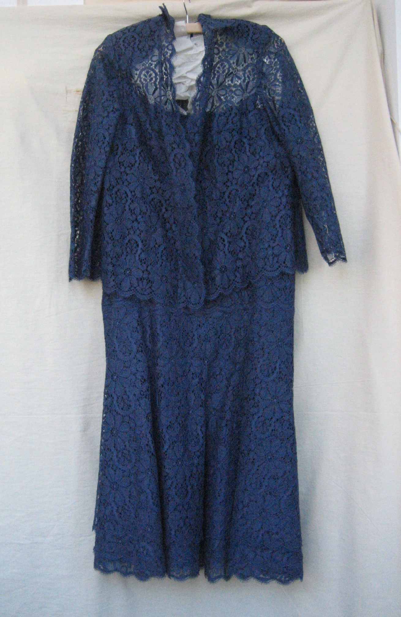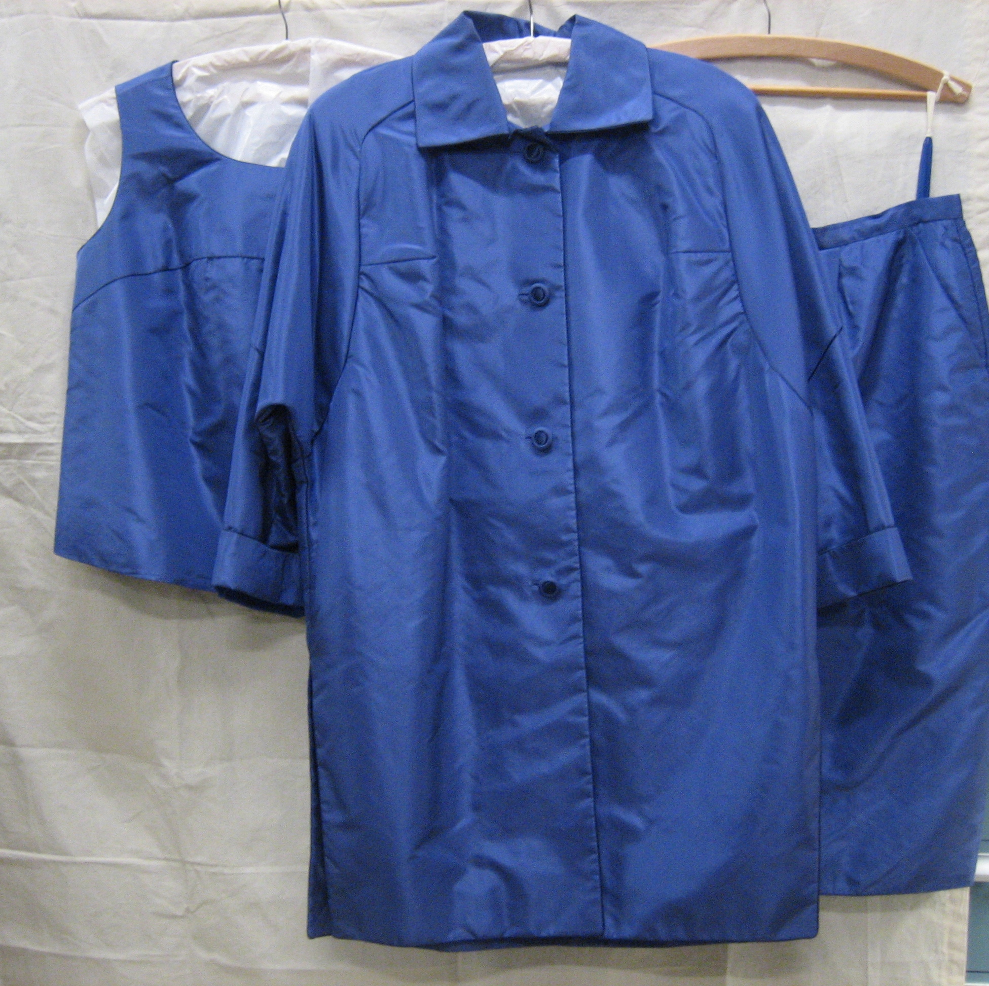Ensemble van blauwe zijde, bestaande uit: jasje, hes...
