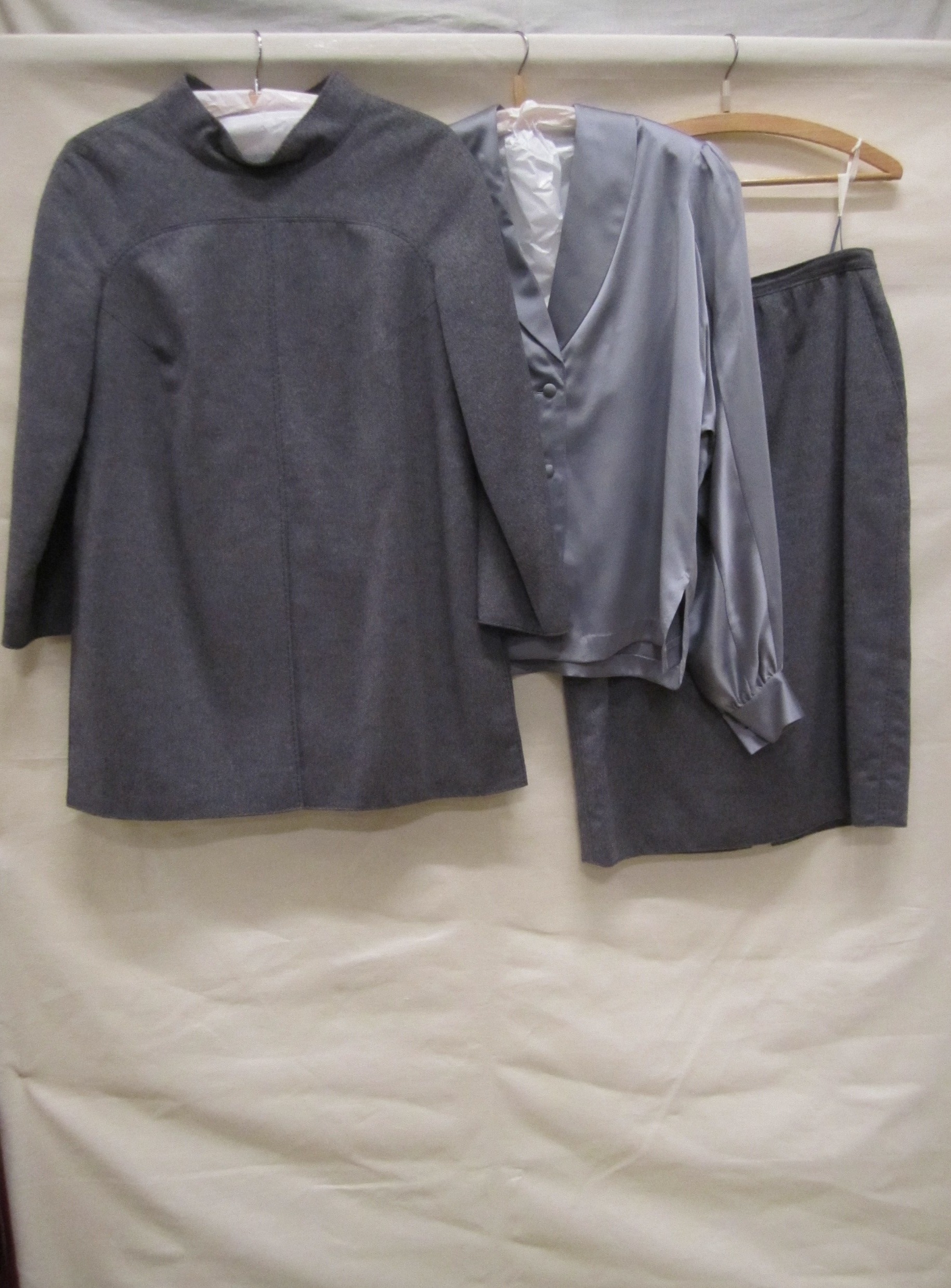 Ensemble in grijs. Bestaande uit een jasje en rok va...
