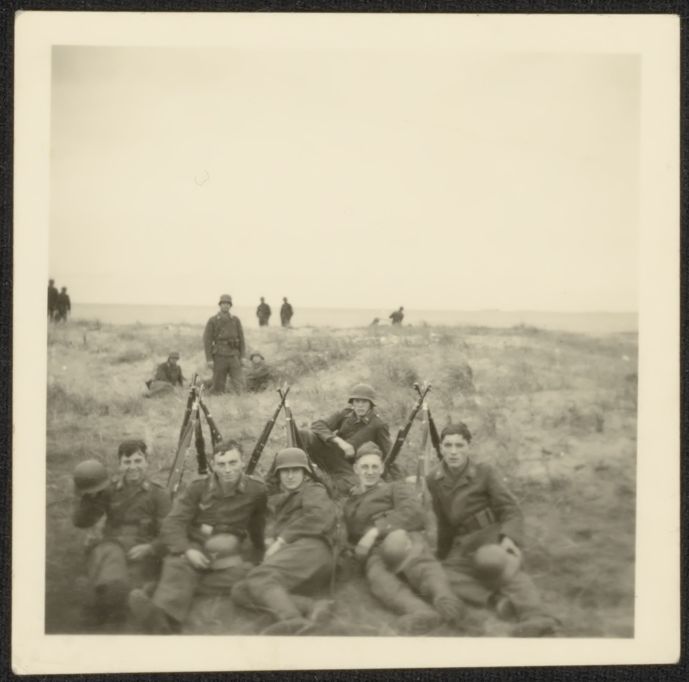 Groepsfoto van militairen die uitrusten in de duinen.