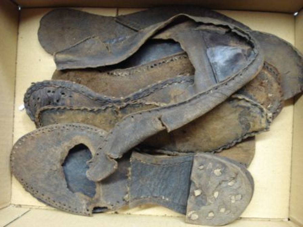 restanten van leren schoen en schoenzolen. Bodemvond...
