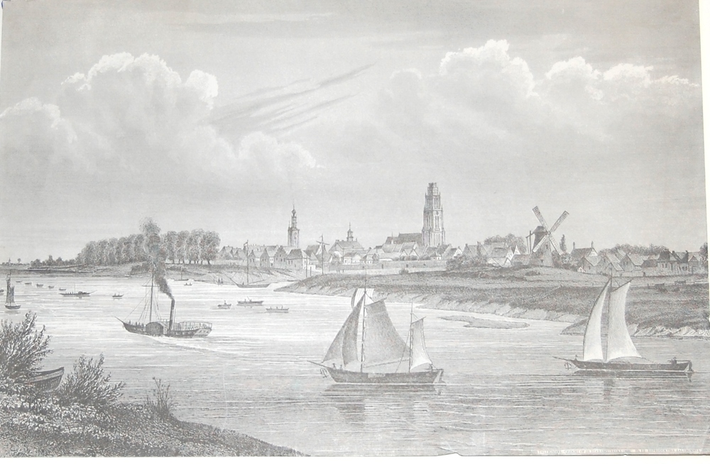 gezicht op de stad Zaltbommel vanaf de rivier. Kerkt...