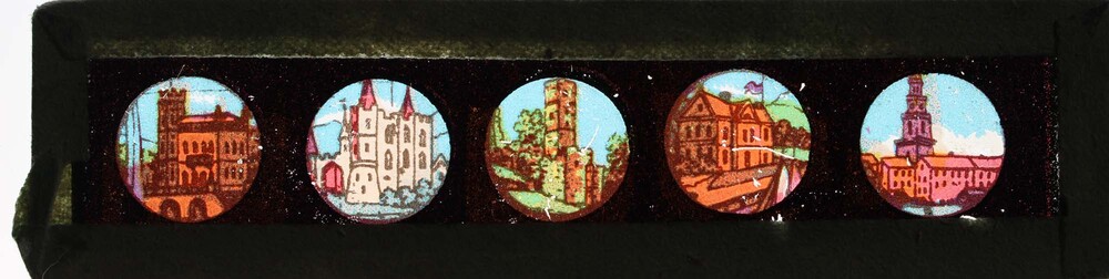 3 toverlantaarnplaatjes met 5 door zwart omgeven, ci...