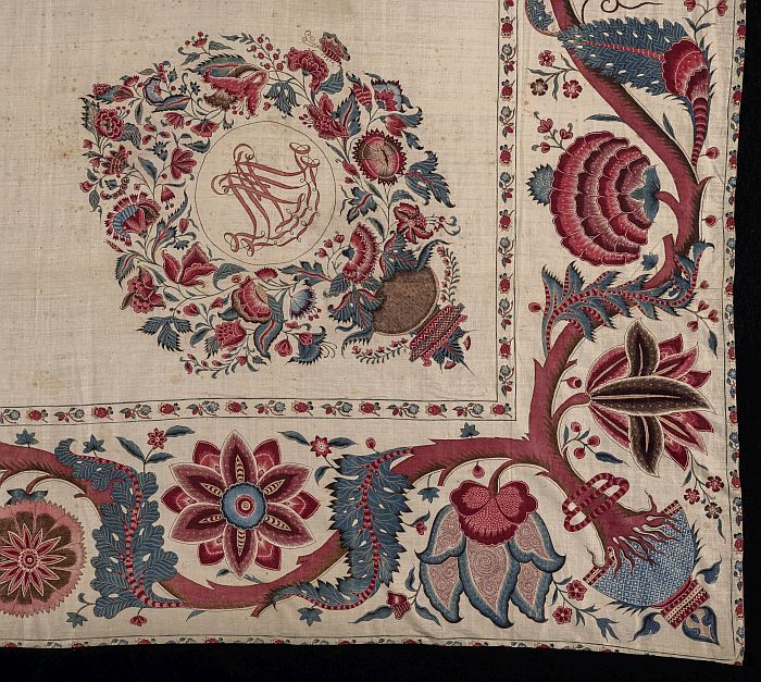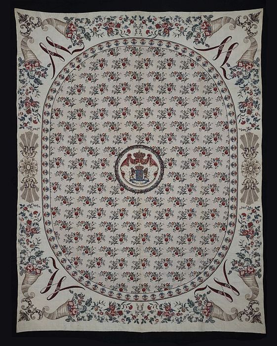 Crèmekleurige sprei, bedrukt met rode bloem en vruch...