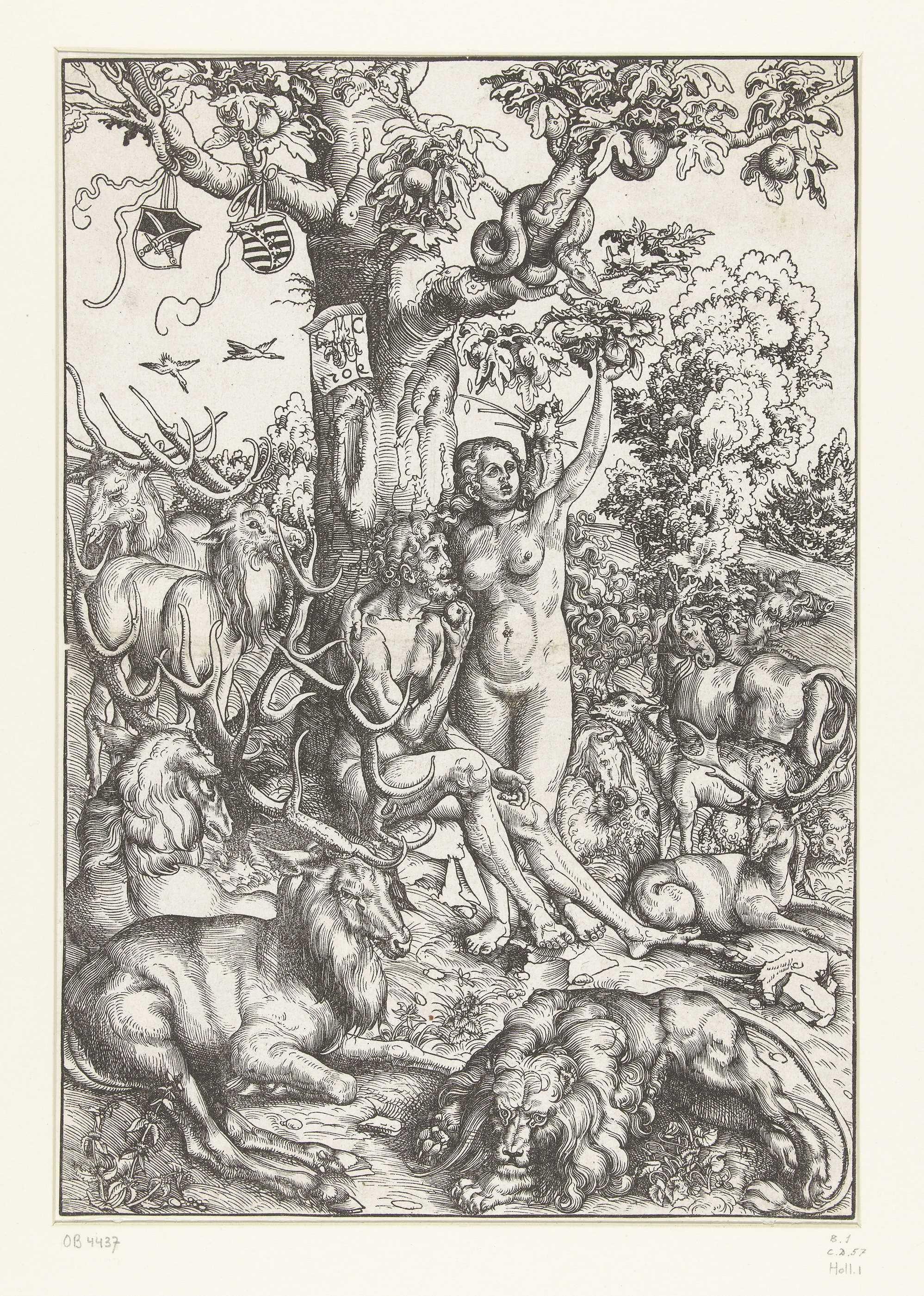 Adam en Eva omringd door dieren in paradijs