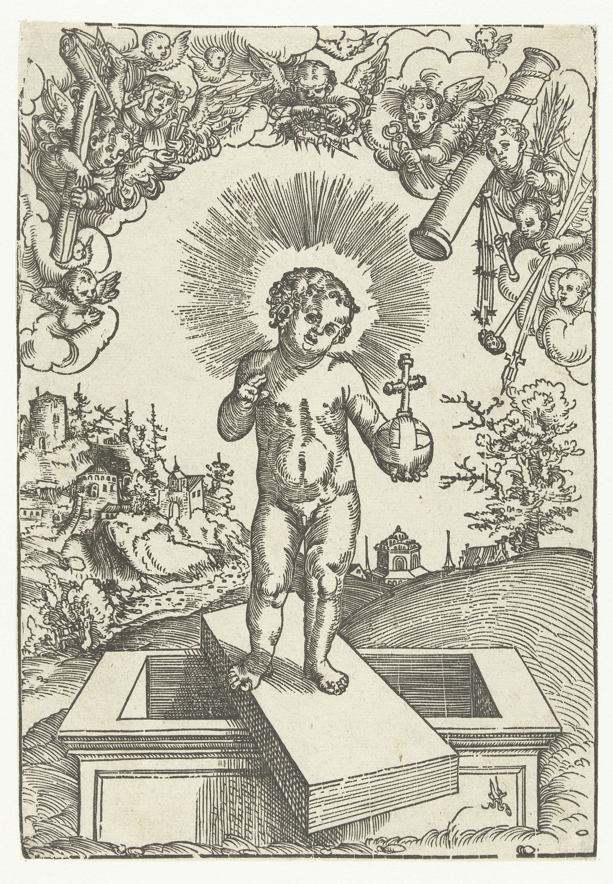 Christuskind als verlosser omringd door engelen met ...