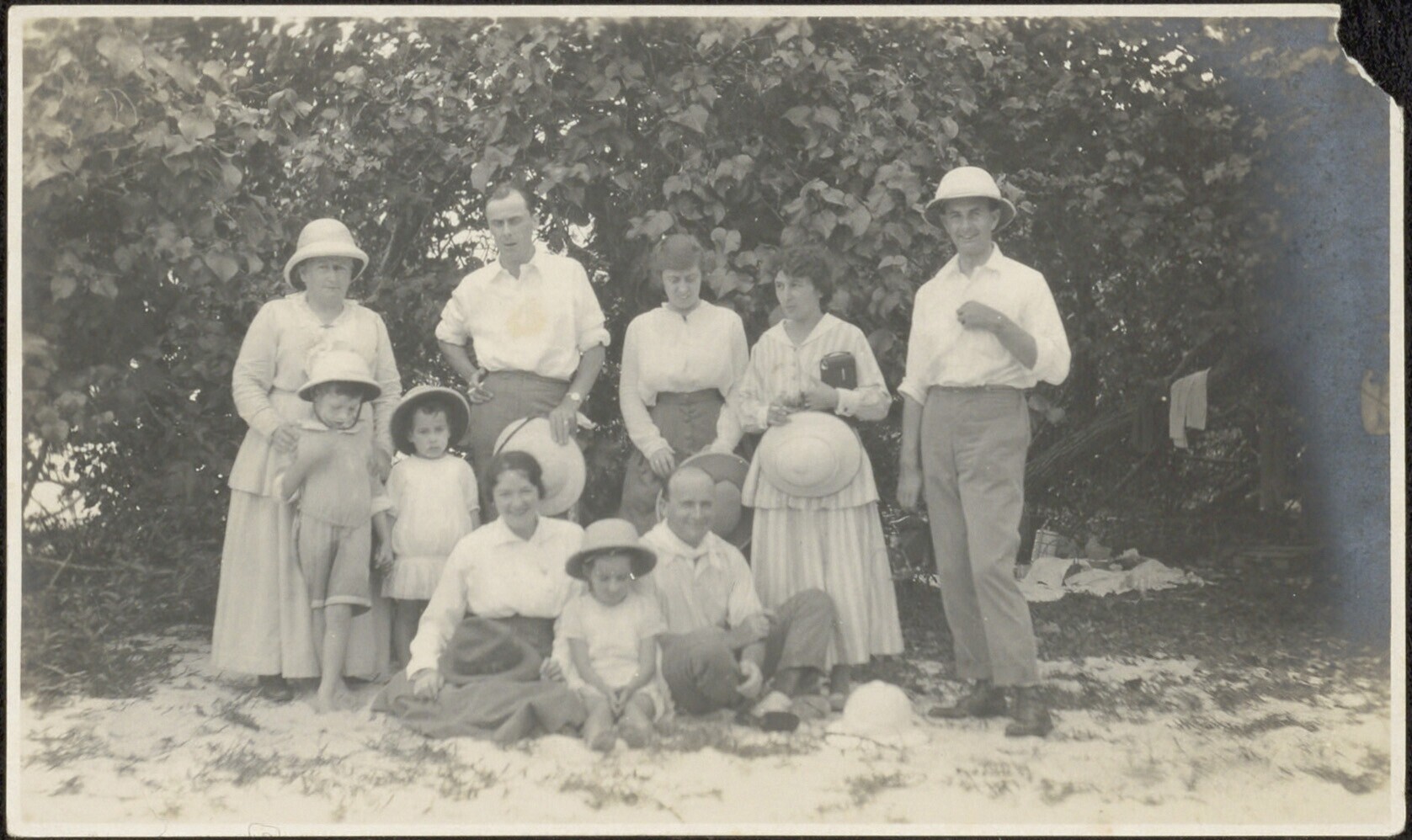 Groepsportret van mannen bij een palm met kokosnoot ...
