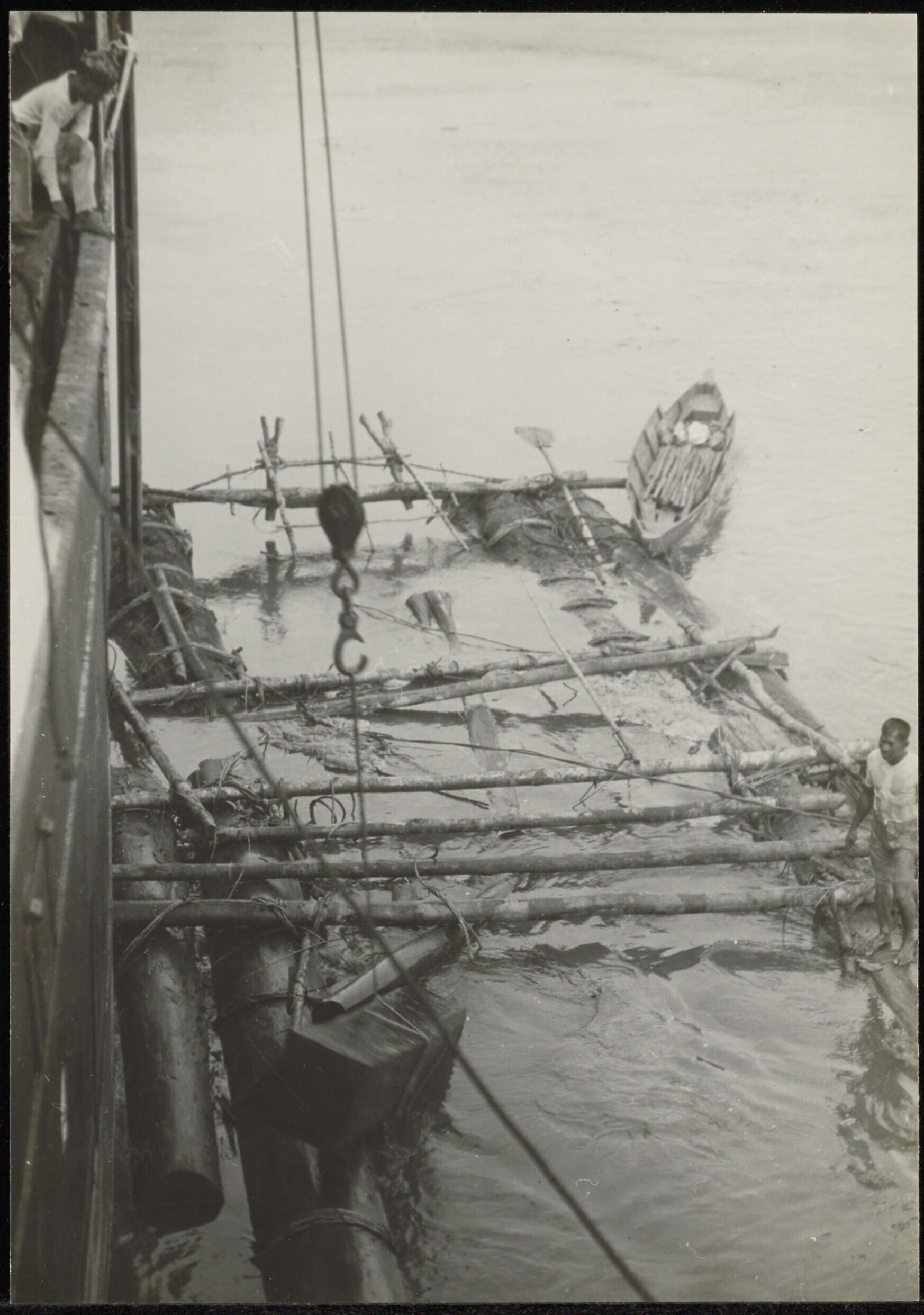 Arbeiders laden een schip met hout vanaf een vlot me...