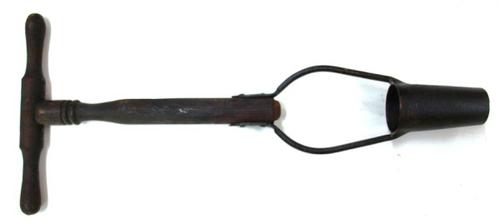 Aardappelpootboor van metaal en hout gebruikt om poo...