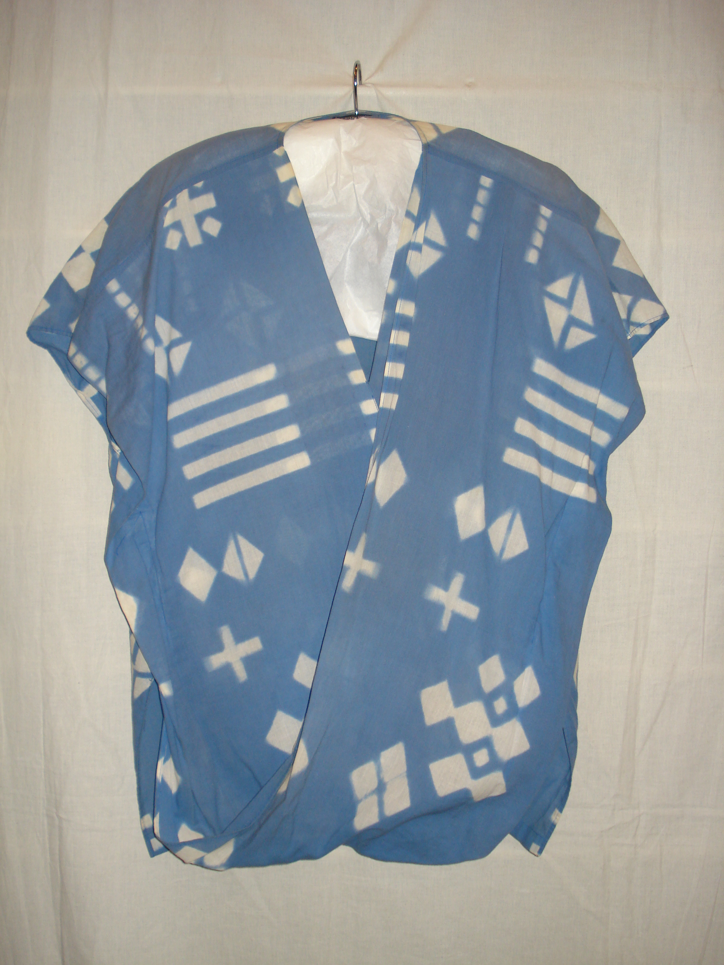Blouse van wit en blauw katoen in batiktechniek, voo...