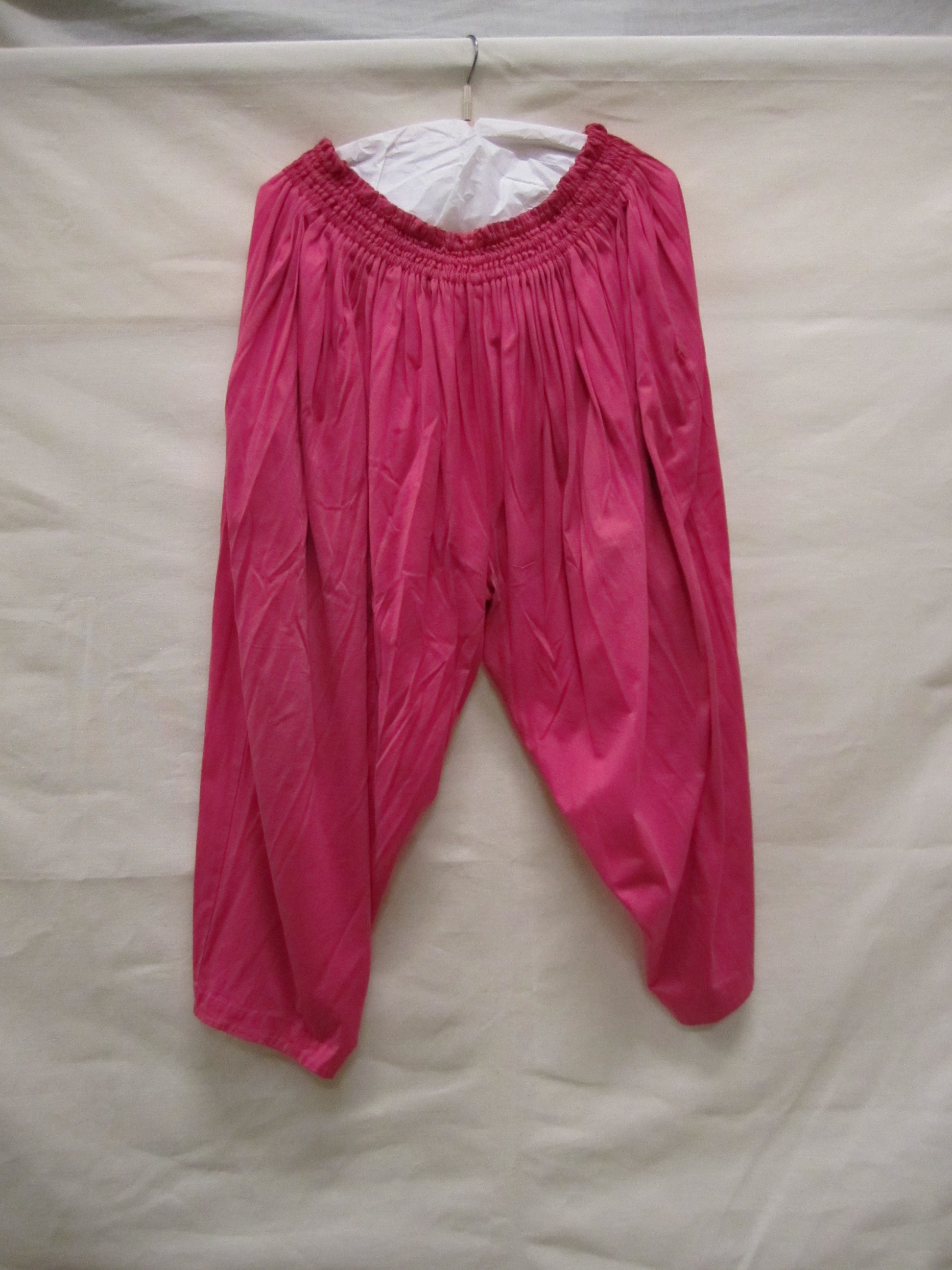 Broek van hard roze katoenen tricot, wijd, halflang ...