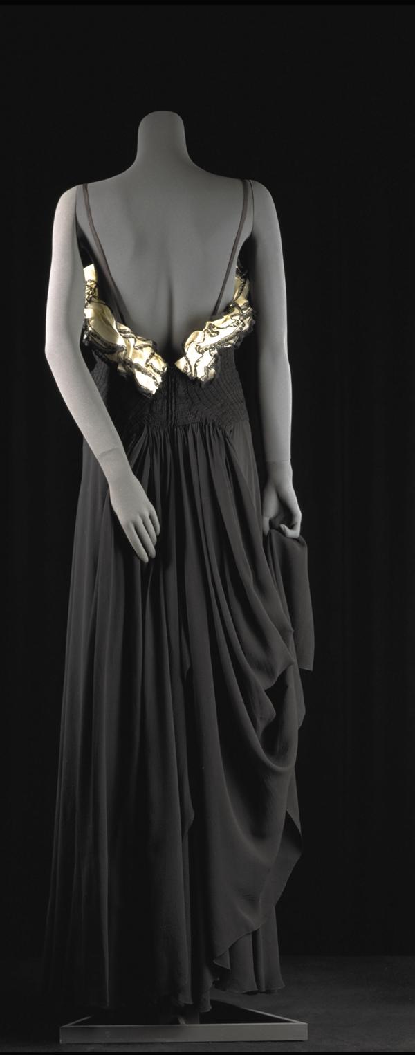 Avondjurk van zwarte crêpe met volants van witte org...