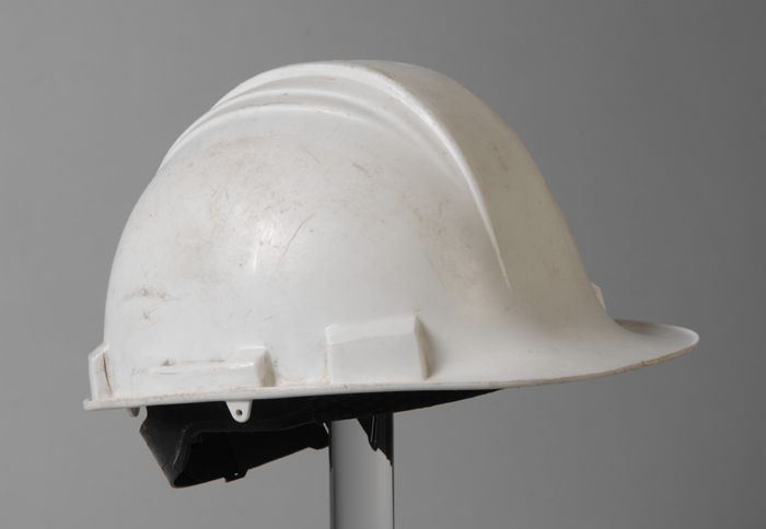 Witte plastic bouwhelm, van Bulgaarse bouwvakker