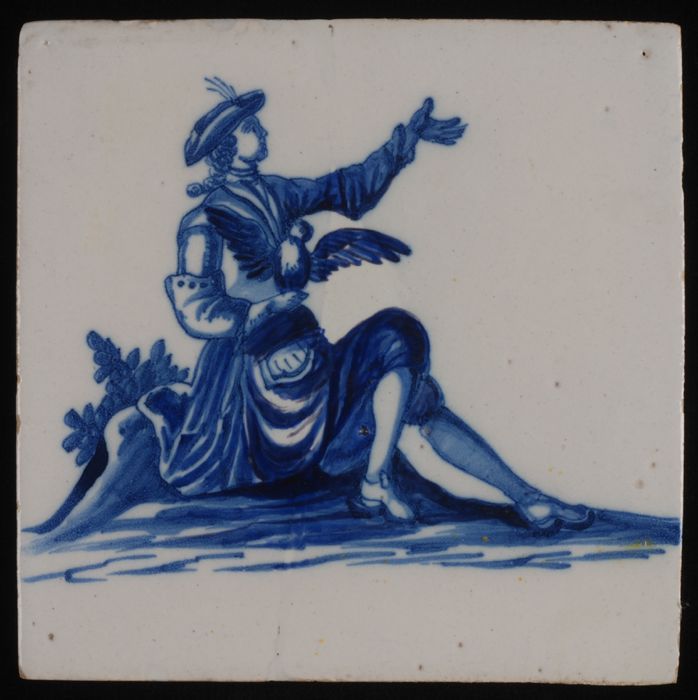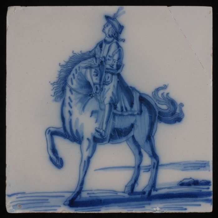 Tegel, blauw op wit, met afbeelding van een ruiter