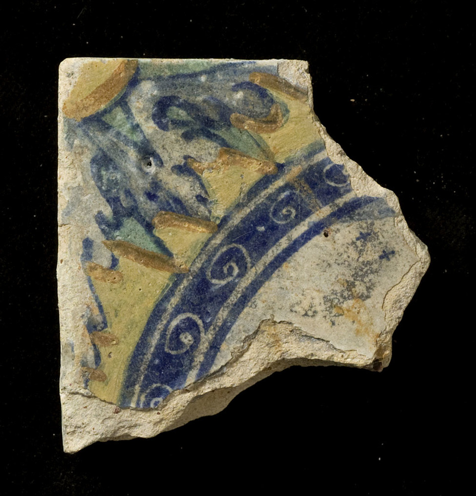 Scherf van keramiek, tinglazuur, voorstellende een c...