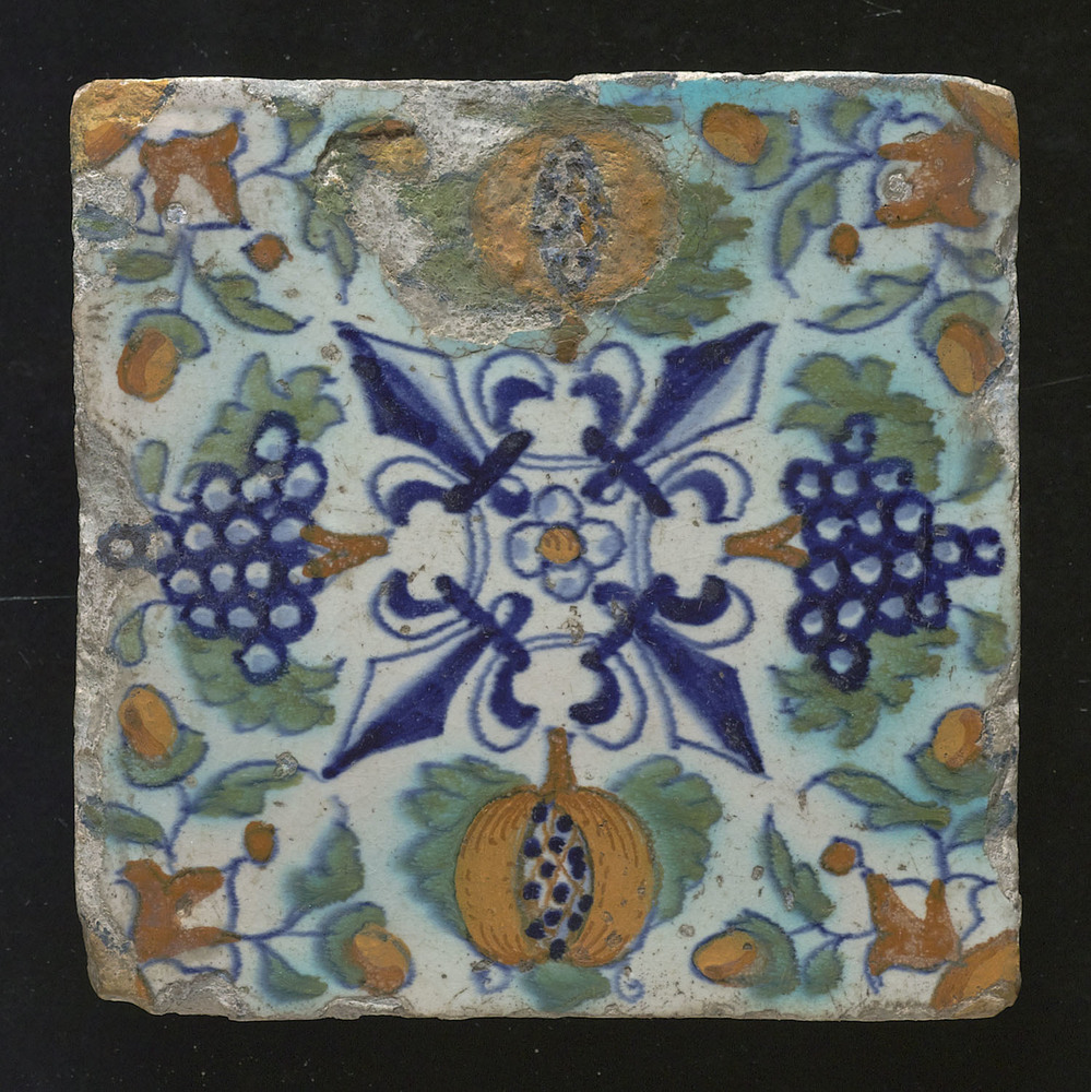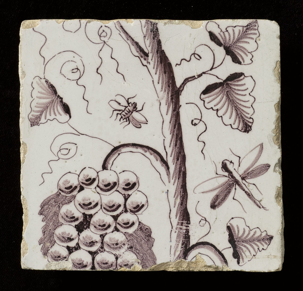 Tegel in tinglazuur, voorstellende druiventrossen en...