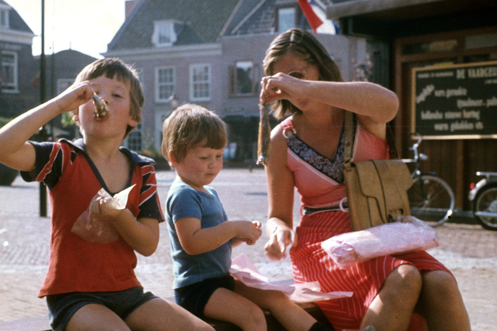Een moeder en haar twee kinderen eten een visje op e...