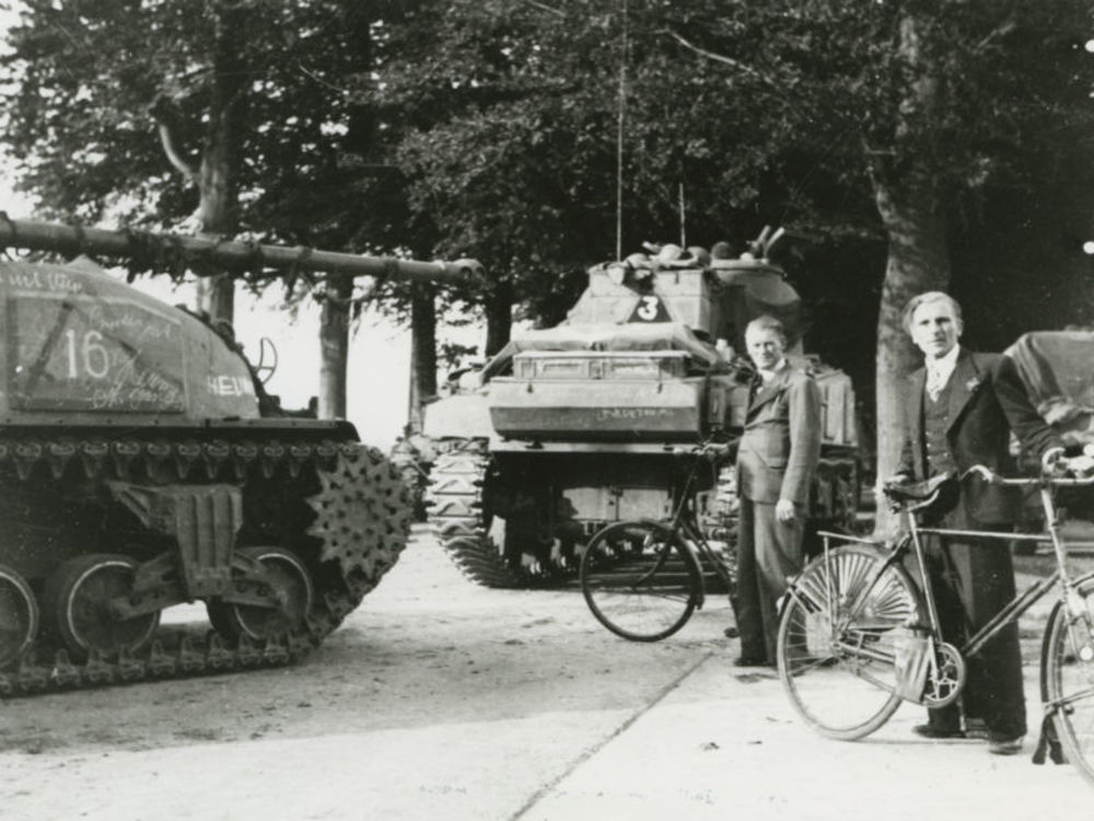 Foto twee Britse Sherman tanks (een is een Sherman f...