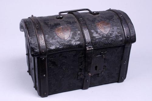 Houten kistje met ijzeren beslag en twee wapenschilden