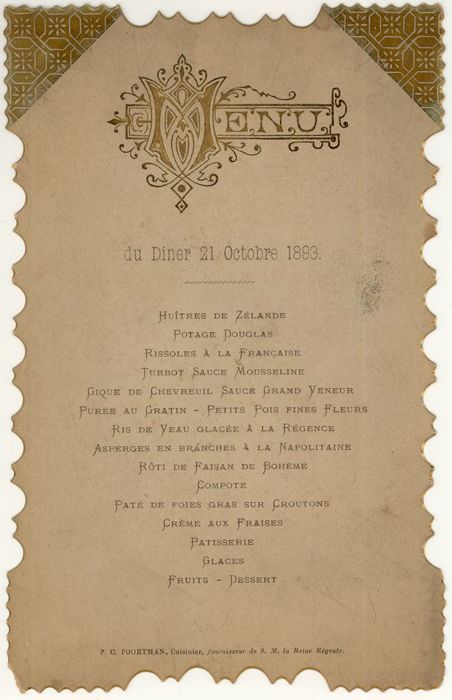 Menukaart met geschulpte rand, versierd met goudkleu...