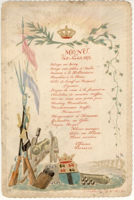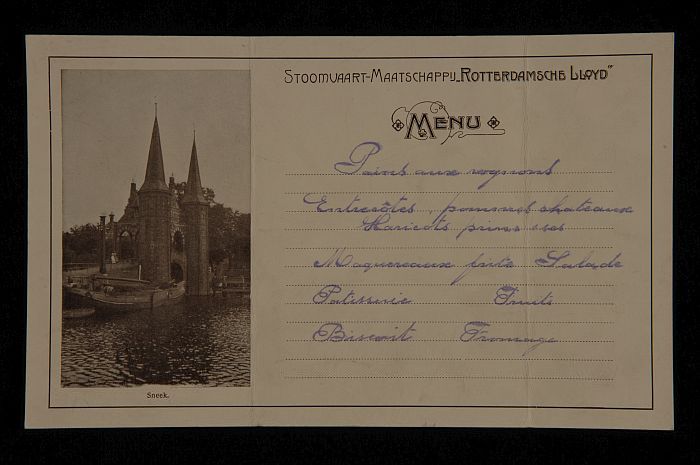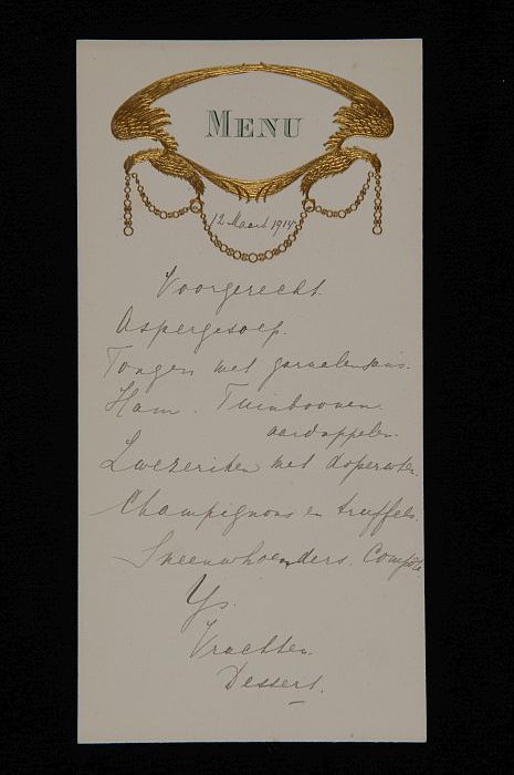 Menukaart met prent van koningin Wilhelmina en daaro...