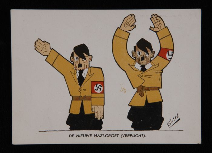 Prentbriefkaart met spotprent op Hitler, met tekst: ...