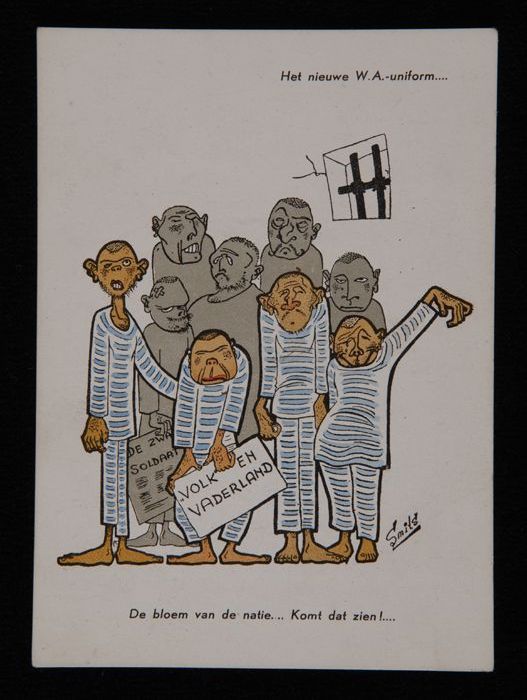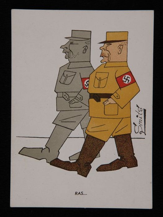 Prentbriefkaart met spotprent op Duitse soldaten, me...