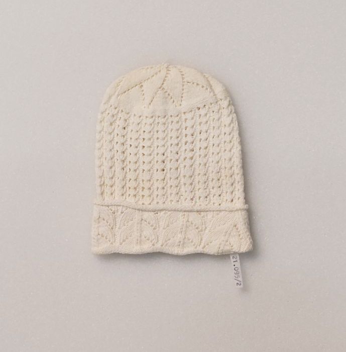 Babyslaapmuts gebreid van wit katoen in ajour, oefening