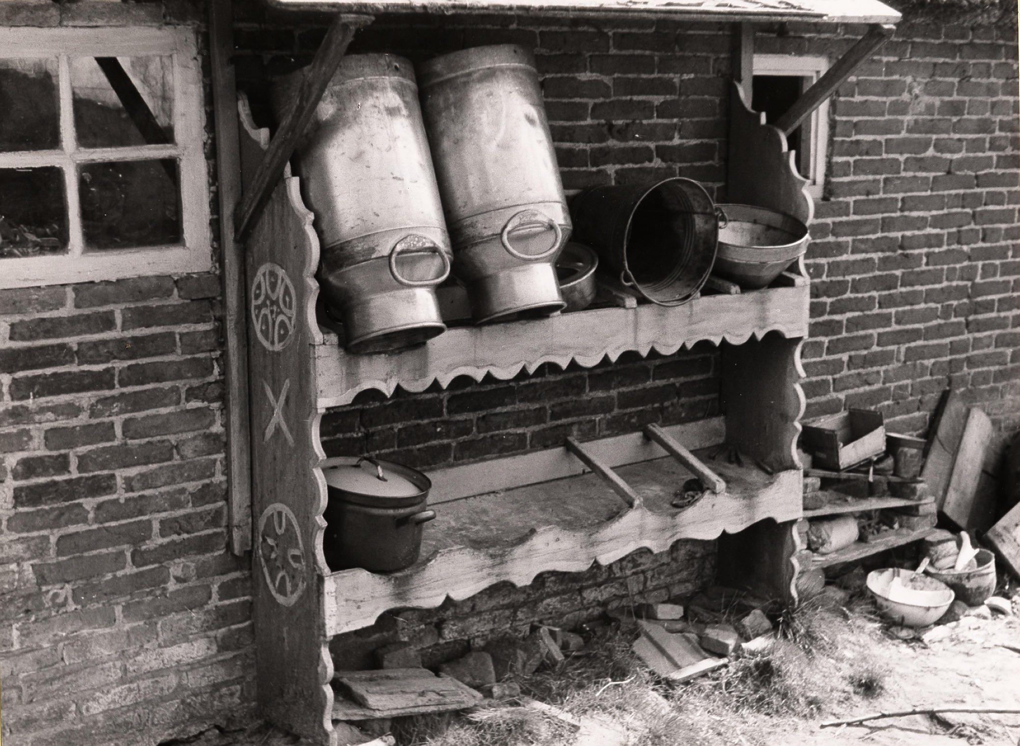 Melkbussenrek en speelhuisje, Staphorst, 1944 (zwart...