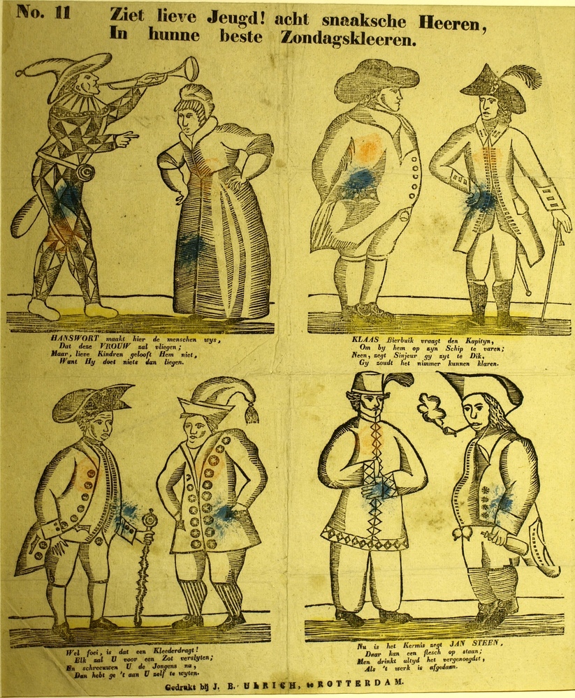 Centsprent van vier gekleurde prentjes en acht snaak...