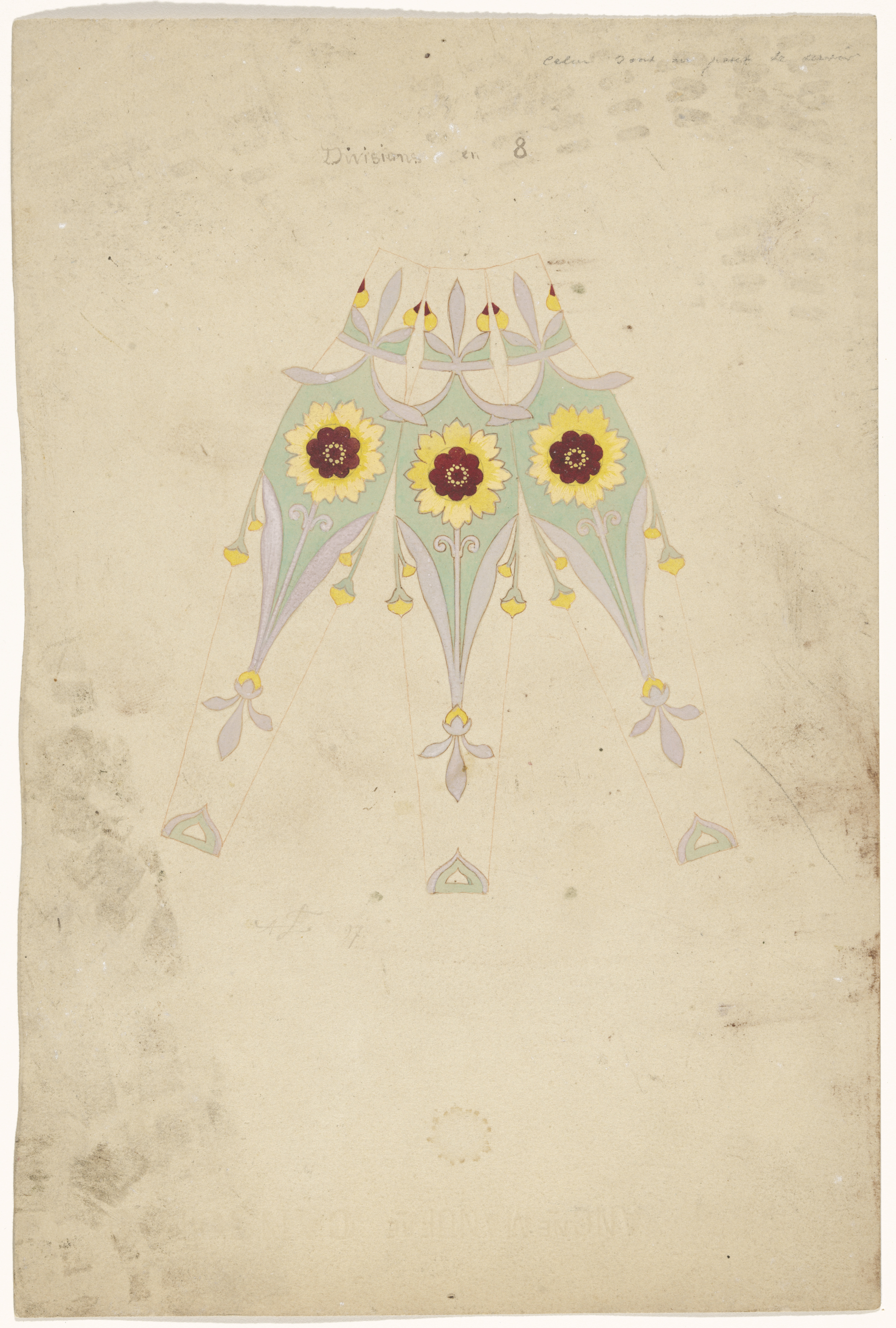 Vijf segmenten van een met viooltjes beschilderde knop