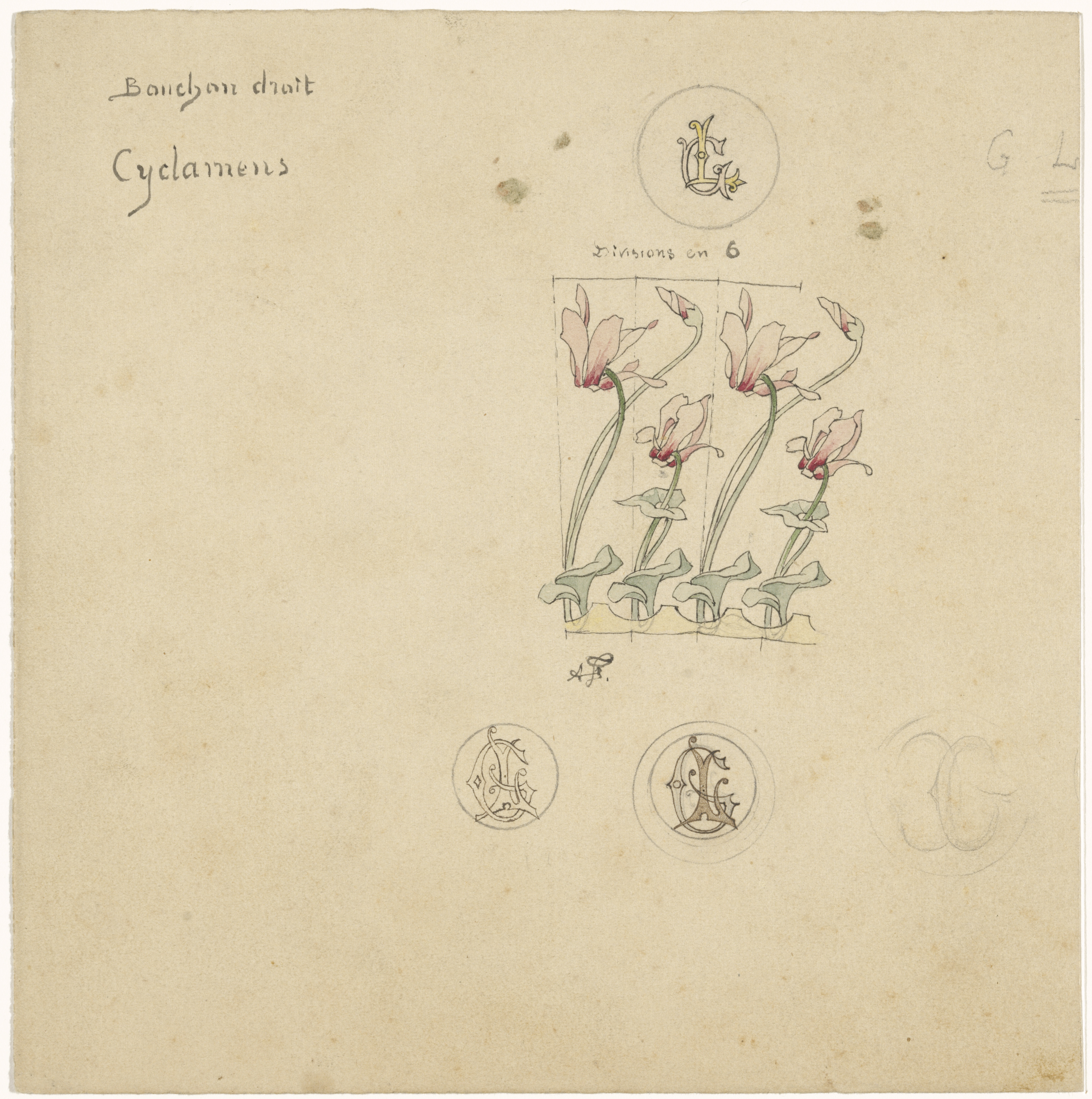 Vier segmenten van een met cyclamen beschilderde knop